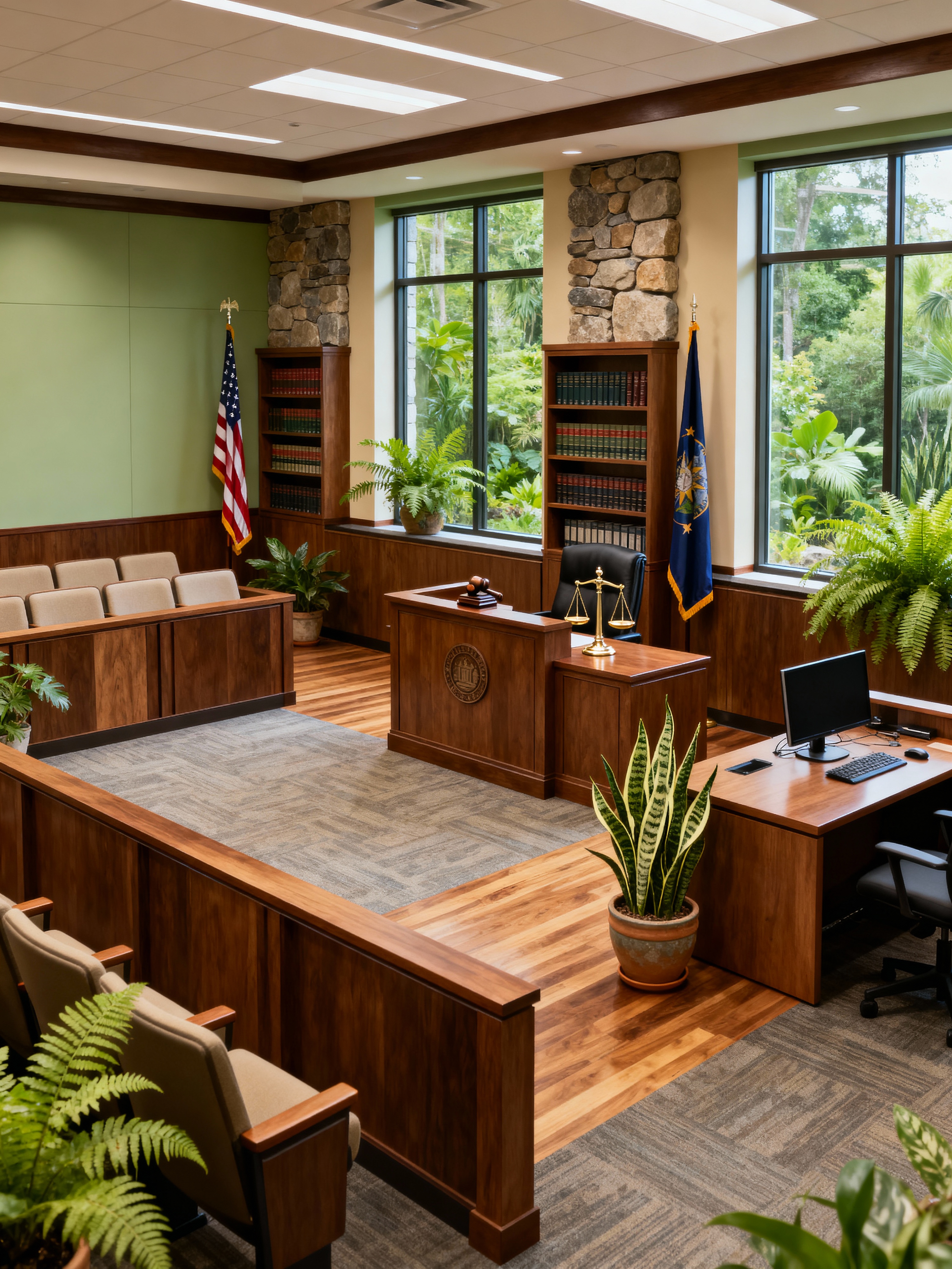 courtroom with biophilic style with gallery seating and witness stand and legal books and scales of justice and judge bench and gavel and flags and court reporter desk. . with natural patterns and ceramic materials and natural elements and plants and calming style and plants and fresh air and natural environment