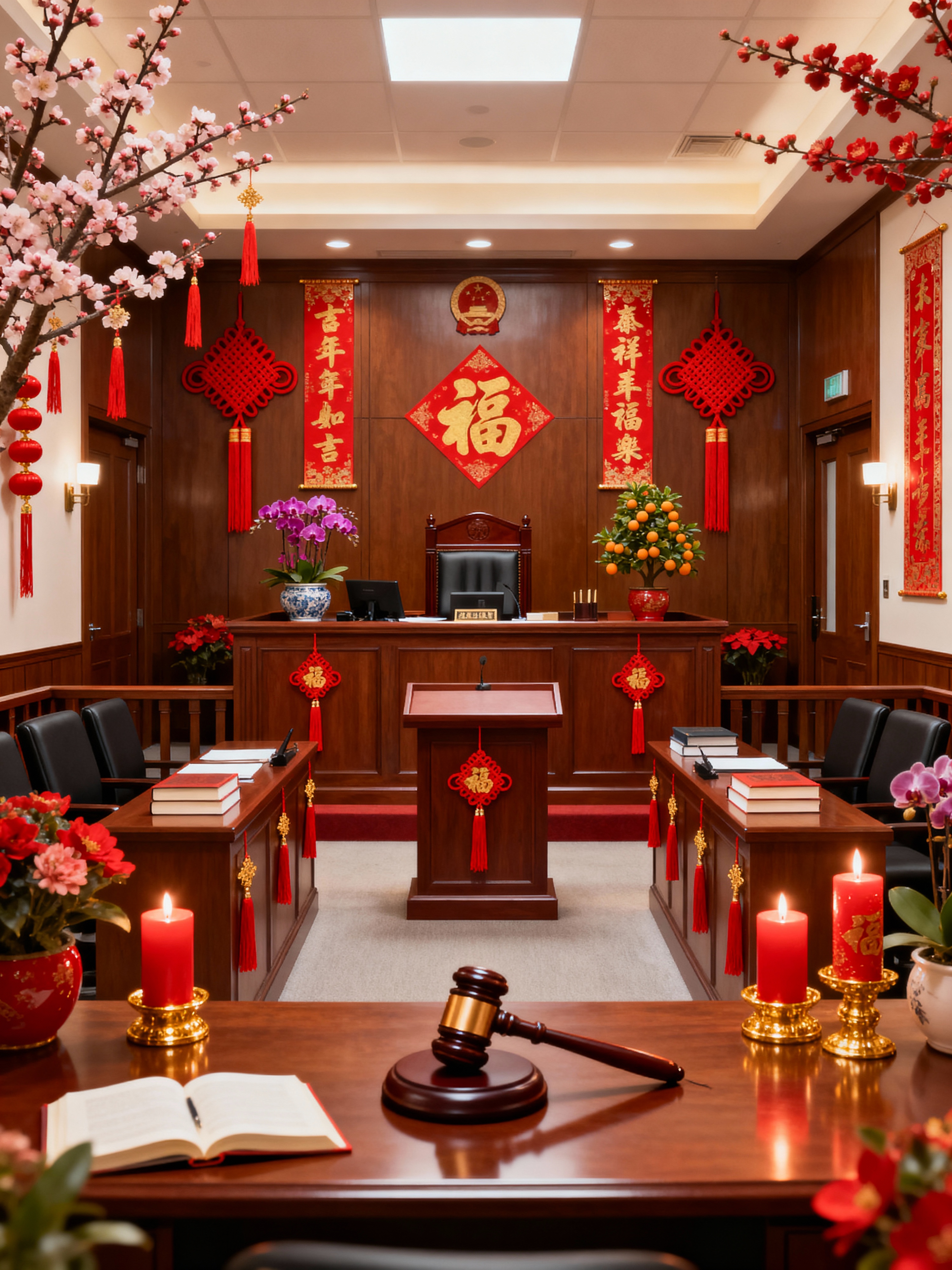 courtroom with chinese new year style with jury box and court reporter desk and attorney tables and legal books and witness stand and gallery seating and judge bench and gavel. . with red and gold candles and red and gold tassels and vases of plum blossoms and orchids and kumquat trees and chinese knots and fai chun banners and mei hwa flowers and door couplets
