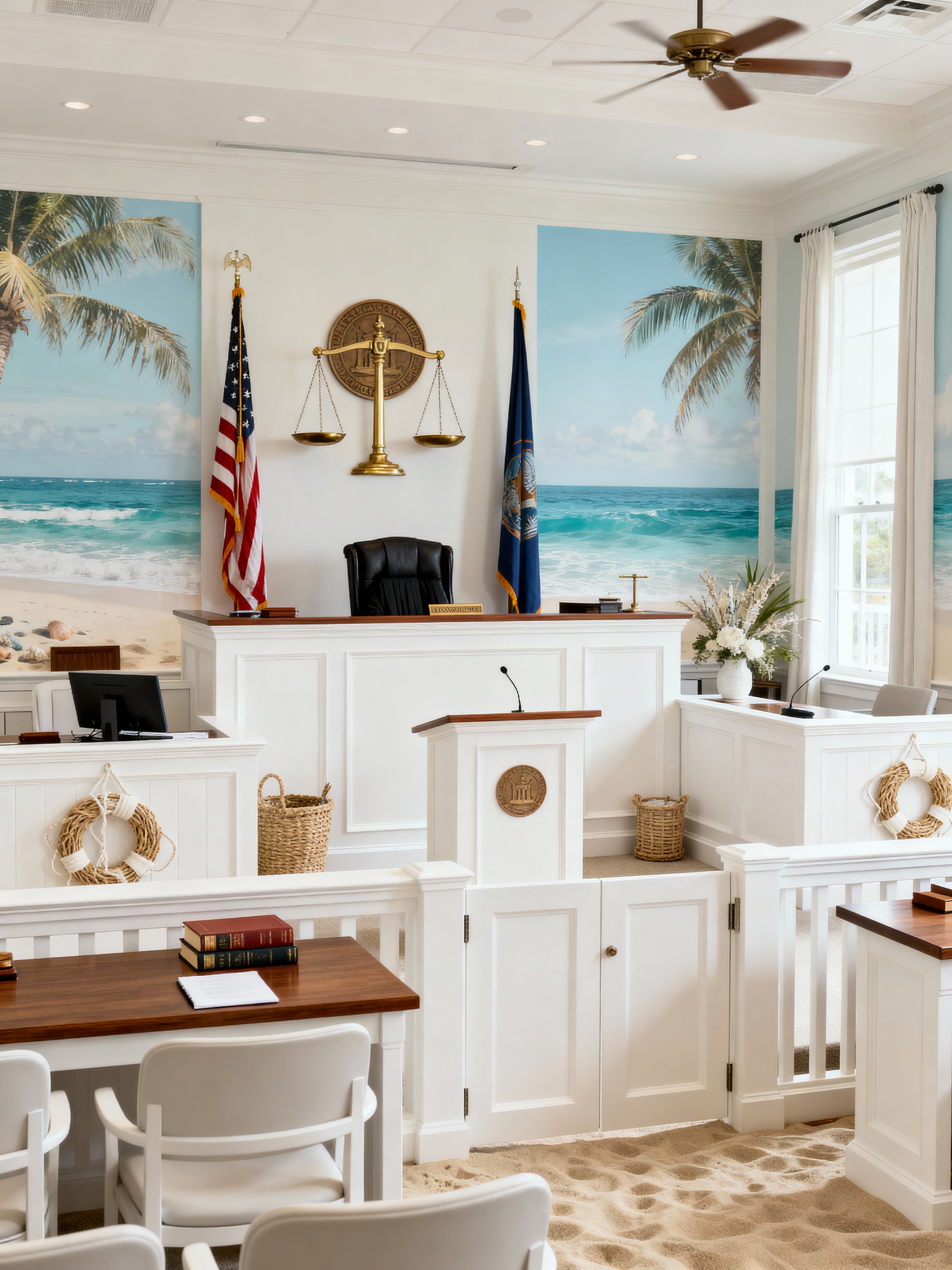 courtroom with coastal style with scales of justice and flags and judge bench and witness stand and attorney tables and gallery seating and legal books and jury box. . with ocean-inspired and seaside colors and natural materials and white decor and sand tones and relaxed style and nautical decor and airy feel