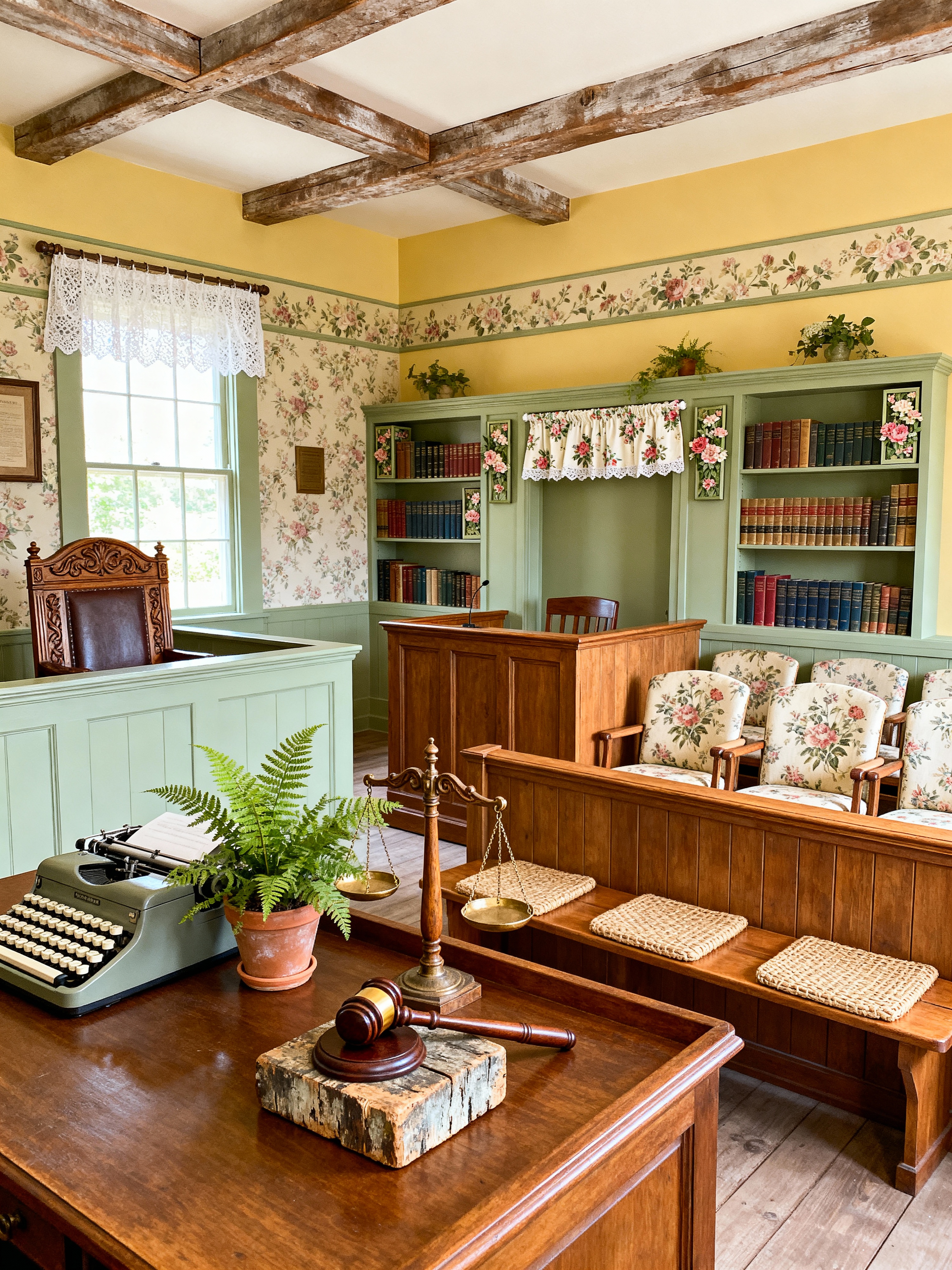 courtroom with cottagecore style with judge bench and scales of justice and court reporter desk and gavel and legal books and gallery seating and witness stand and jury box. . with organic and country style and earthy and muted colors and rustic and cottage style and floral patterns and traditional