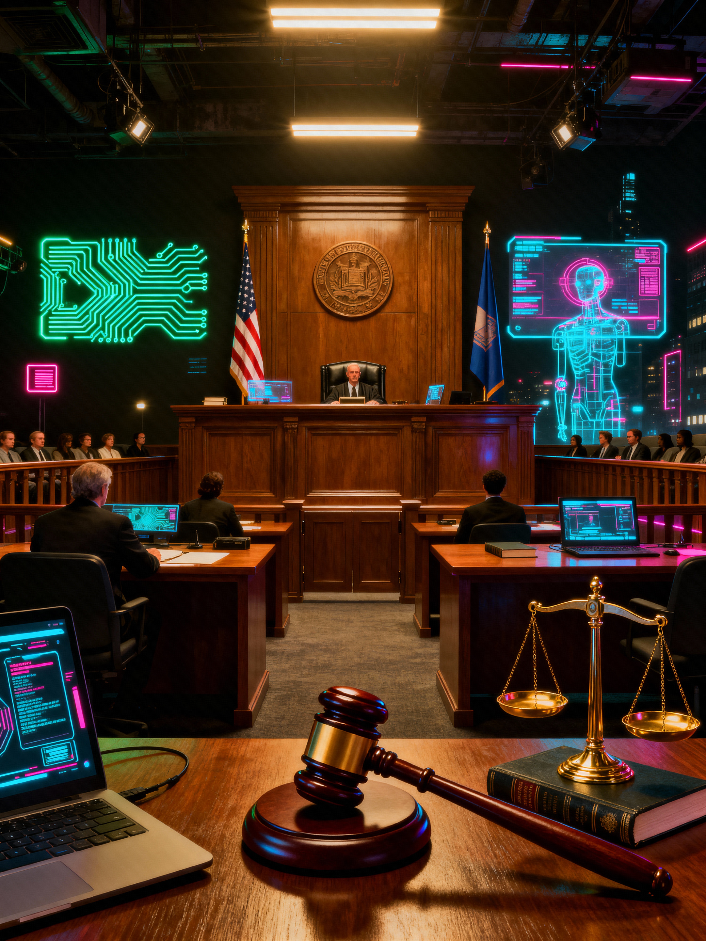 courtroom with cyberpunk style with gavel and scales of justice and jury box and flags and judge bench and court reporter desk and legal books and attorney tables. . with bladerunner lights and cyberpunk lights and dark night and futuristic cybernetic details and cyberpunk lights and cyberpunk style and bladerunner style and led lights