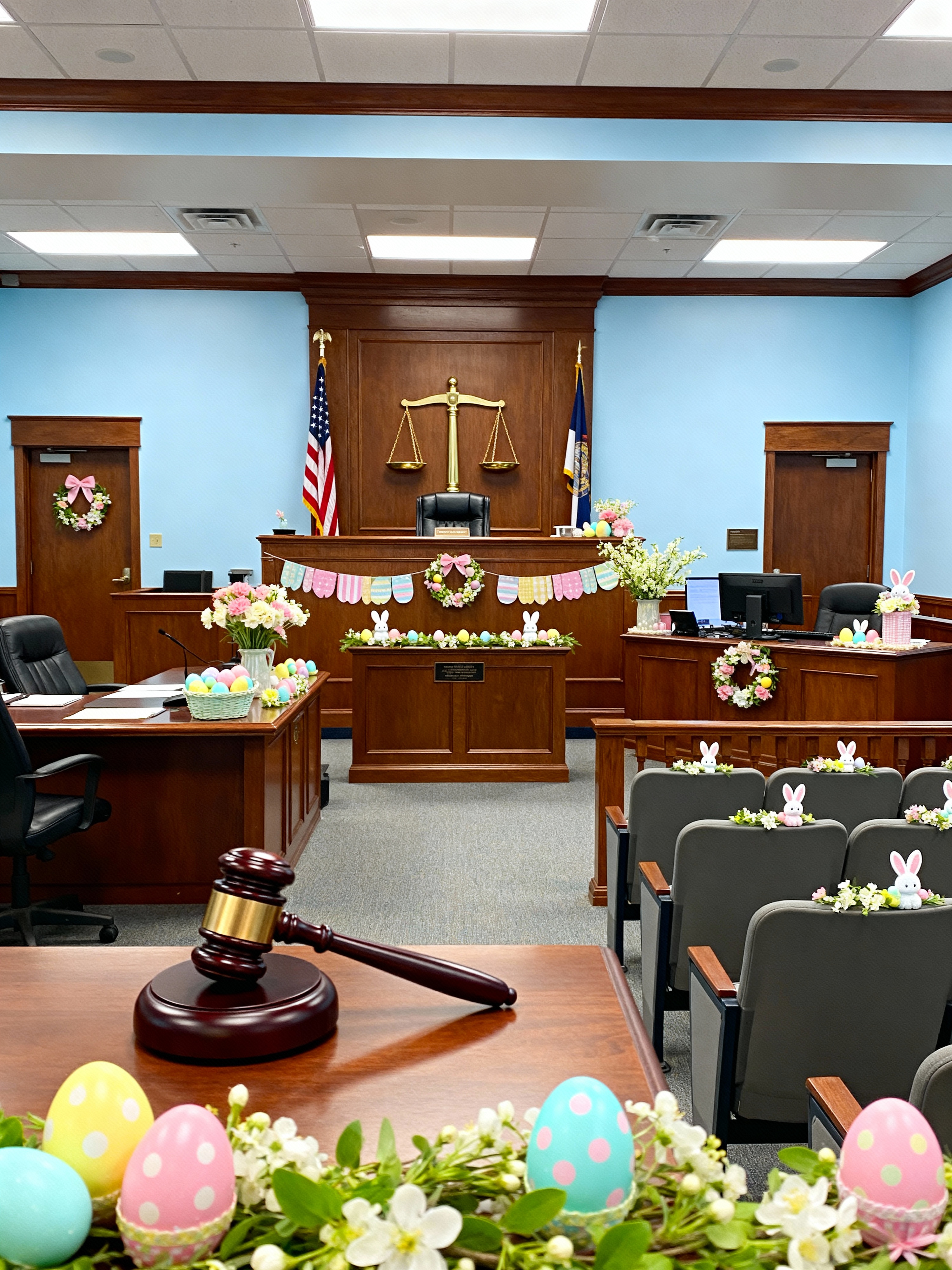 courtroom with easter style with gavel and scales of justice and attorney tables and flags and jury box and court reporter desk and witness stand and gallery seating. . with easter decorations and light blue colors and spring decorations and colorful easter eggs and flowers on table and easter decorations