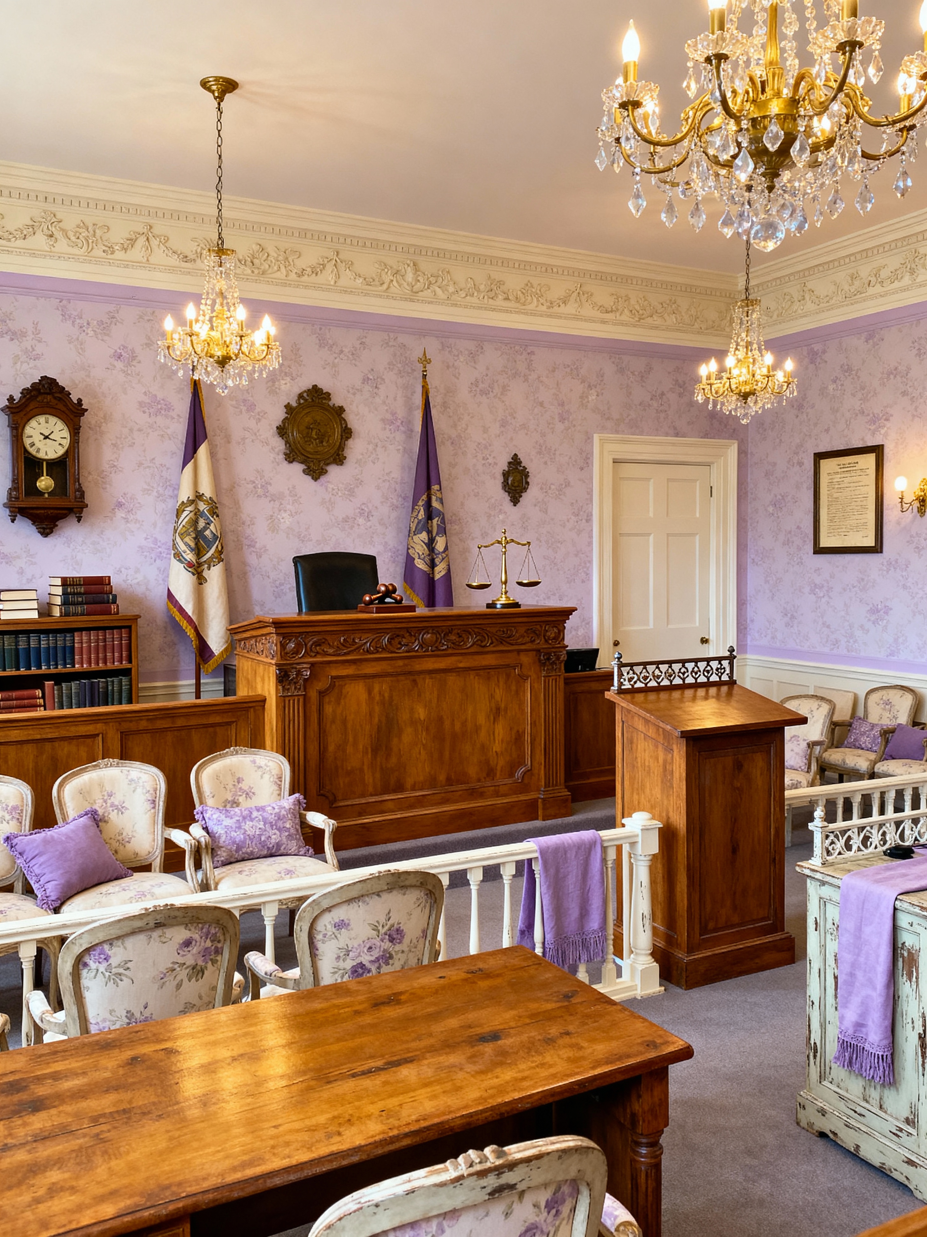 courtroom with french country style with judge bench and legal books and flags and gallery seating and court reporter desk and witness stand and gavel and scales of justice. . with elegant rustic and soft fabrics and chandeliers and ornate details and lavender accents and antique decor and vintage furniture and textured walls
