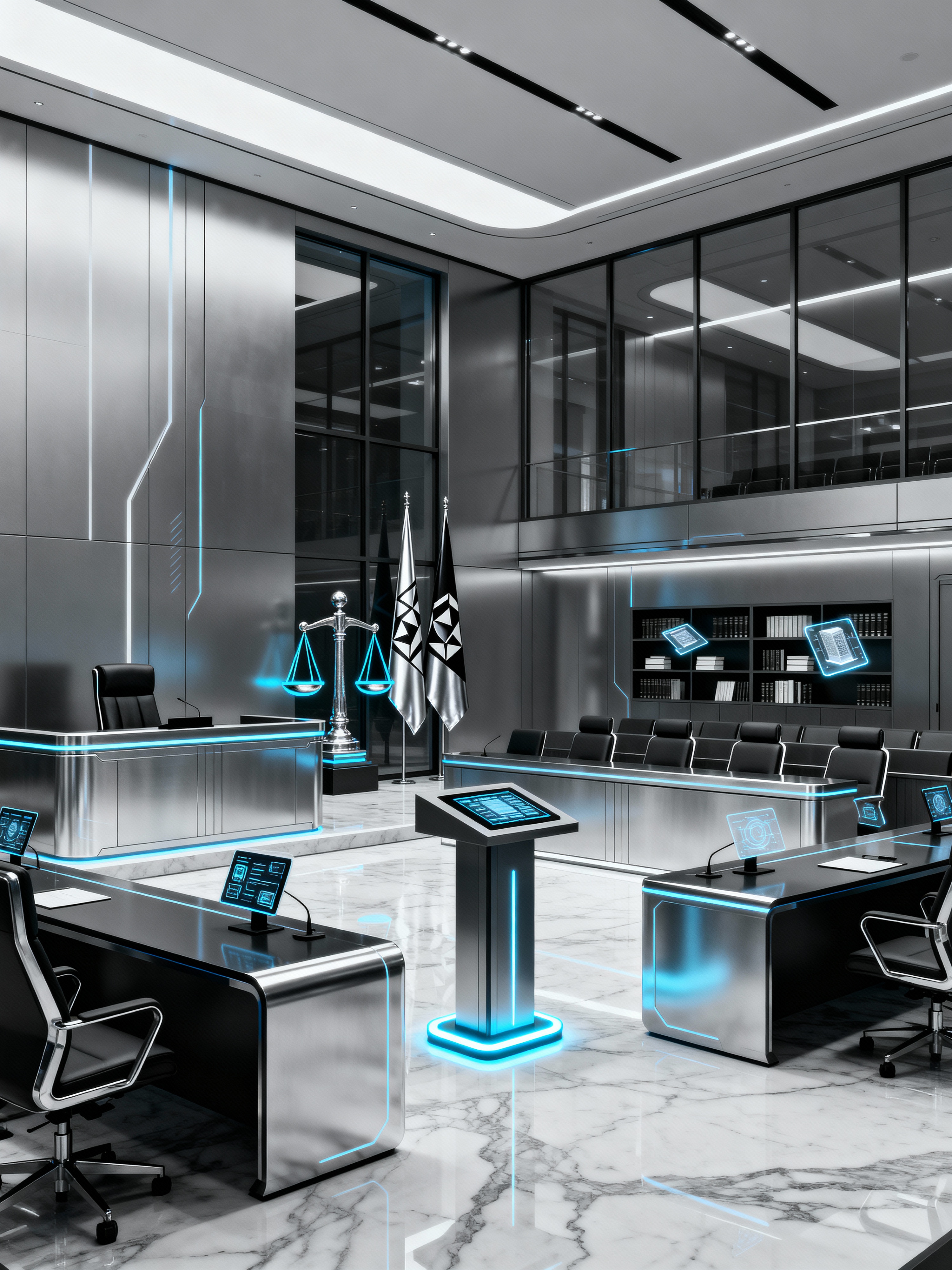courtroom with futuristic style with scales of justice and jury box and judge bench and legal books and witness stand and court reporter desk and attorney tables and flags. . with futurism and monochromatic palette and futuristic interior and smooth marble and futurism minimalist interior and spaceship interior and steel finishing and glass panes