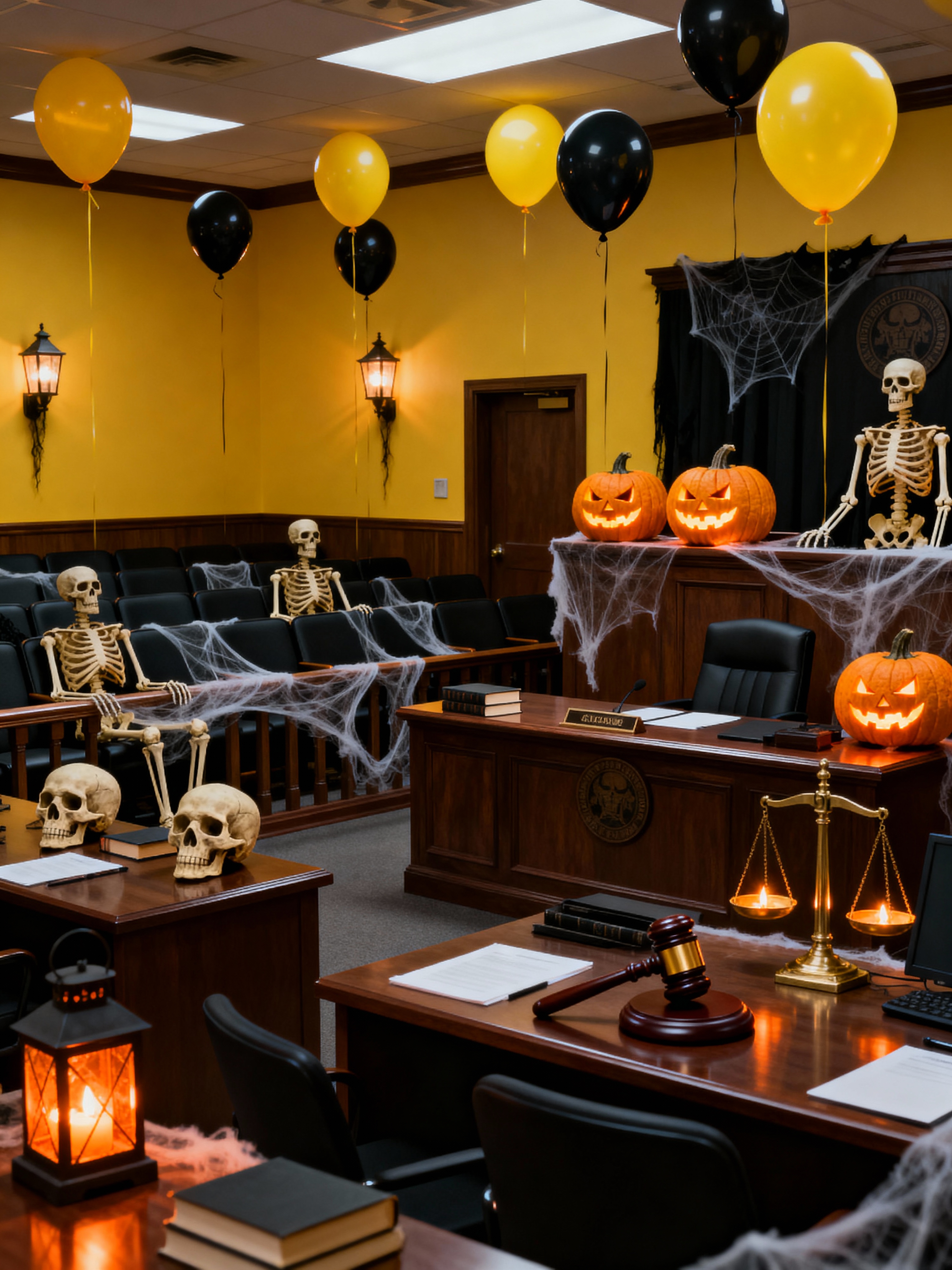 courtroom with halloween style with gallery seating and gavel and legal books and witness stand and attorney tables and court reporter desk and jury box and scales of justice. . with cobwebs and lanterns and yellow black balloons and human skulls and lanterns and cobwebs and glowing pumpkins and skeletons sitting and standing