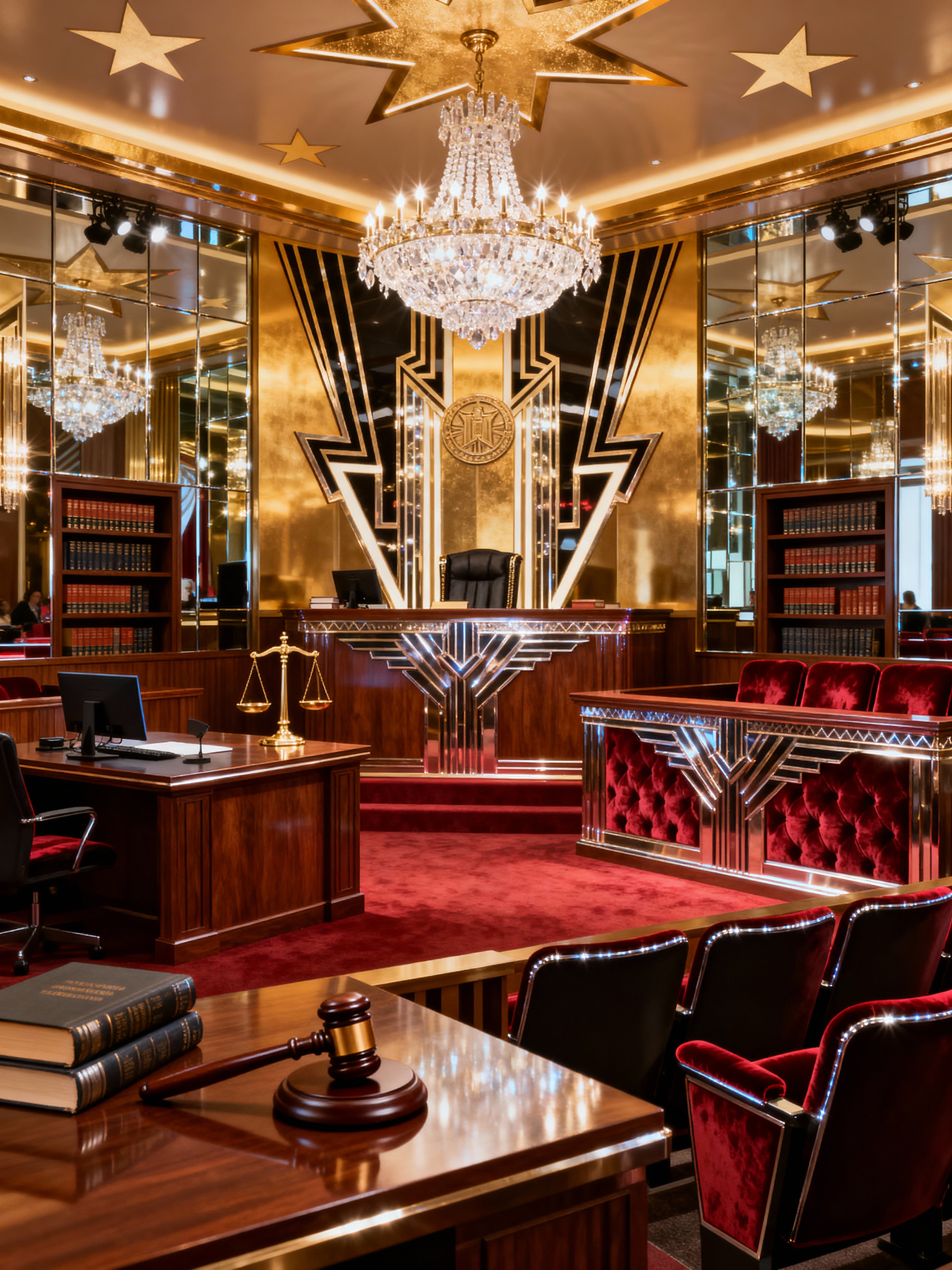 courtroom with hollywood glam style with witness stand and court reporter desk and judge bench and scales of justice and jury box and gavel and legal books and gallery seating. . with mirrored surfaces and dramatic lighting and star quality and luxurious fabrics and crystal chandeliers and velvet upholstery and art deco influence and metallic accents