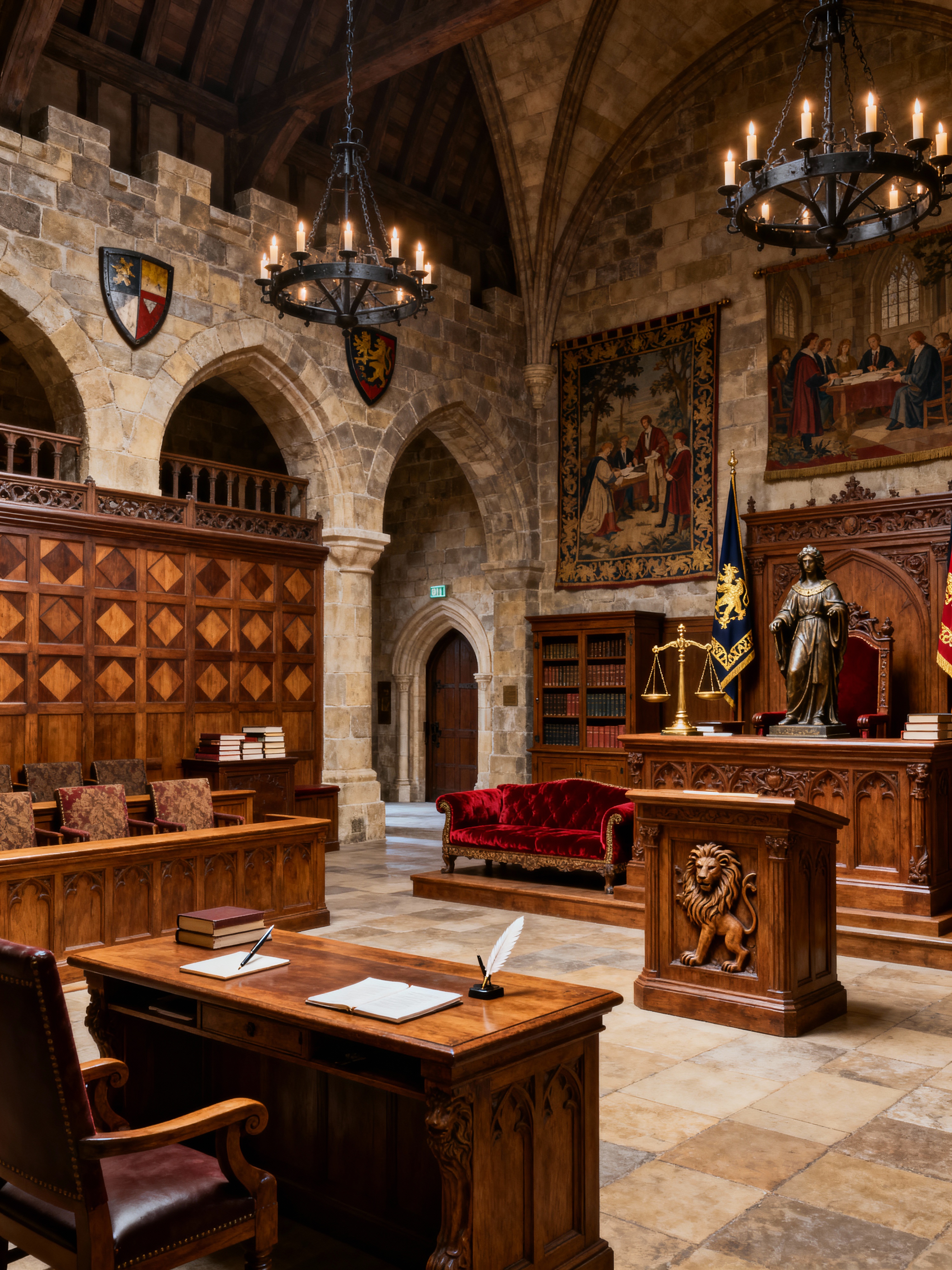 courtroom with medieval style with jury box and scales of justice and flags and gallery seating and legal books and judge bench and court reporter desk and witness stand. . with intricate wooden inlay designs and carvings and heavy furniture pieces and carved wooden benches and castle interior and medieval shields on the wall and castle interior and upholstery on chairs and sofas and timber walls