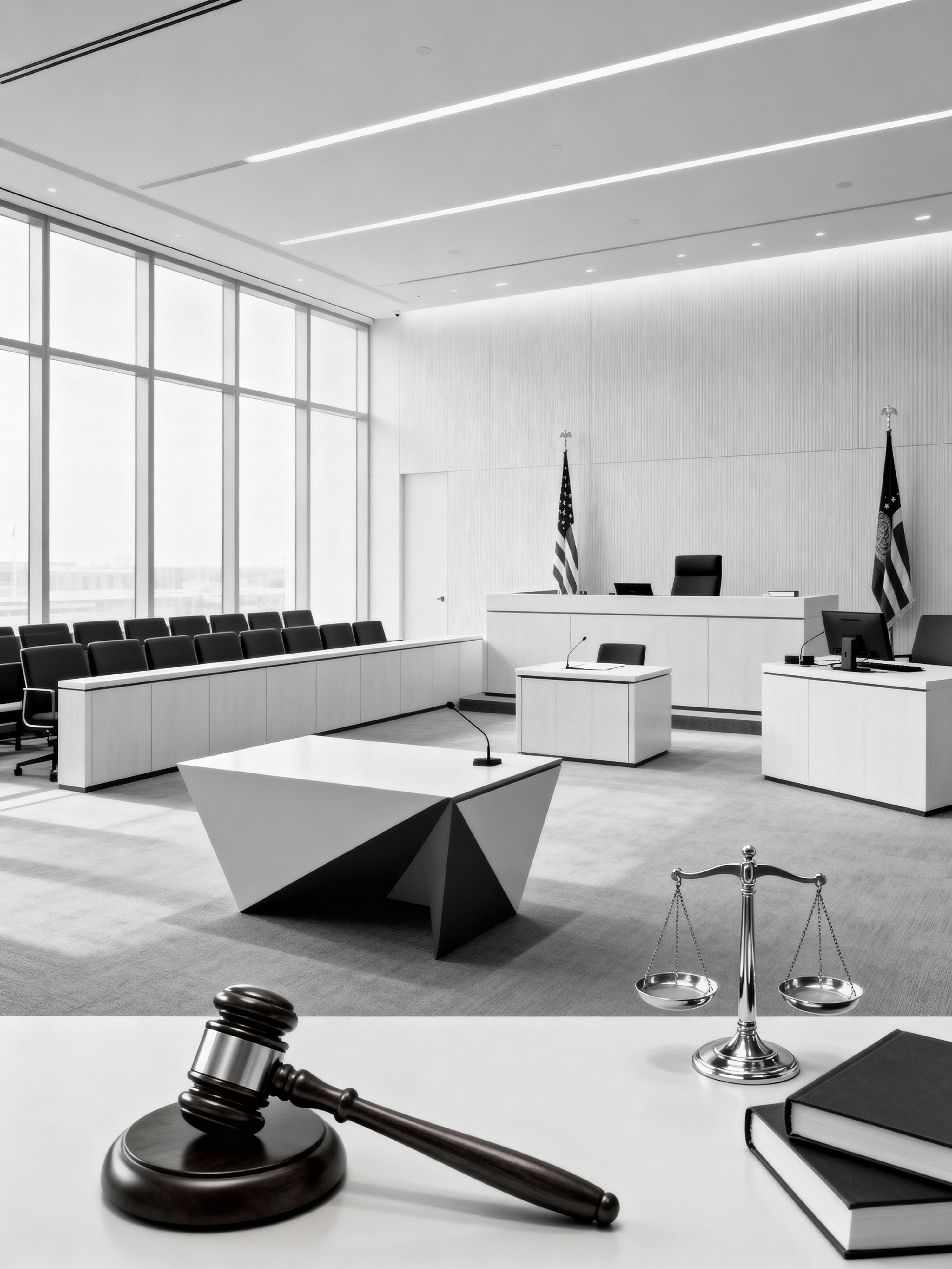 courtroom with minimalist style with gavel and gallery seating and jury box and scales of justice and court reporter desk and attorney tables and flags and legal books. . with focus on the shape, colour and texture of just a few of essential elements and lots of light and clean lines and an open floor plan and functional furniture and a monochromatic palette with colour used as an accent and focus on the shape, colour and texture of just a few of essential elements