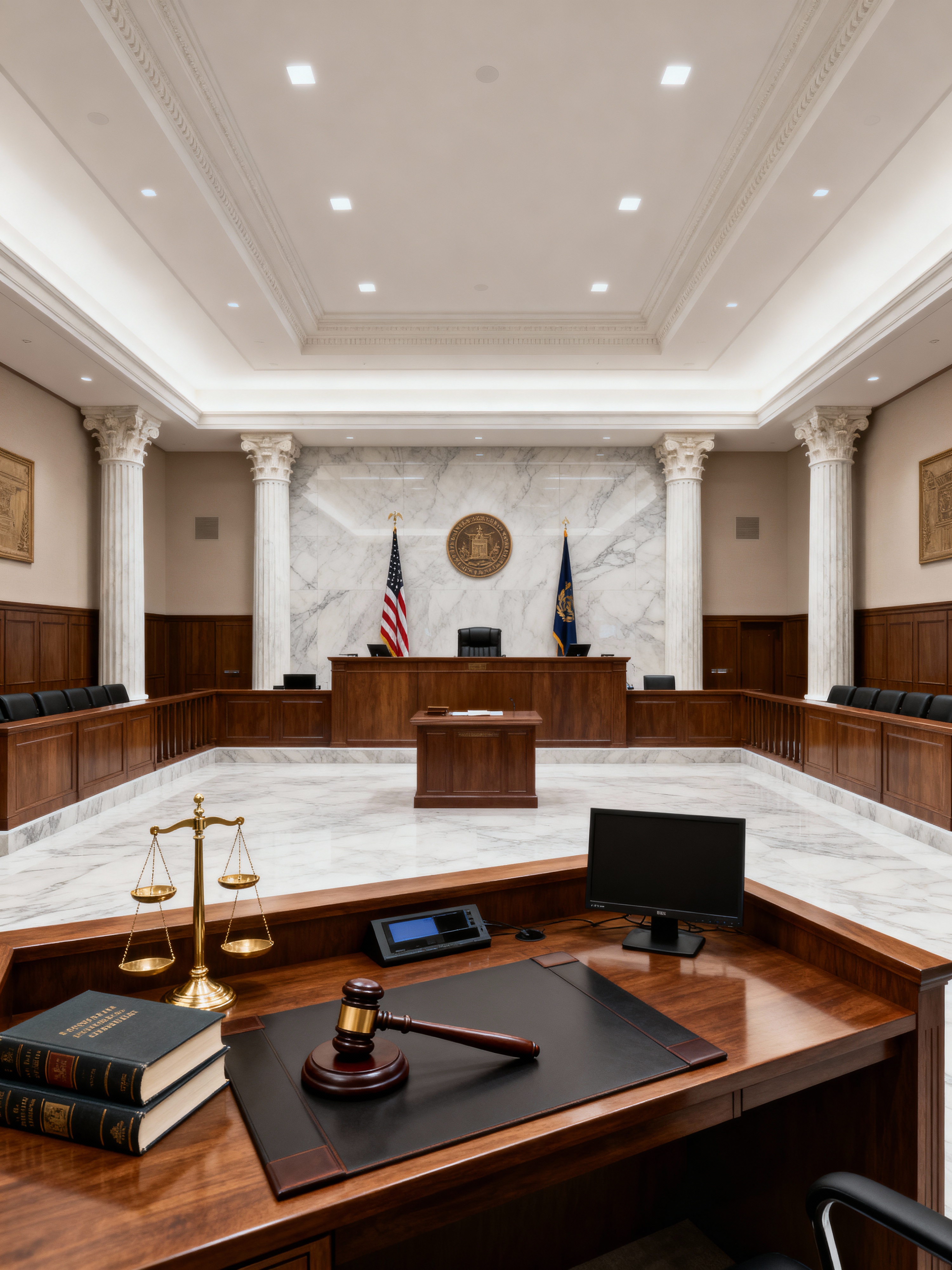 courtroom with neoclassic style with scales of justice and gavel and legal books and flags and jury box and witness stand and court reporter desk and judge bench. . with greek columns and high ceilings and symmetric layouts and thoughtful minimalism and elegant and sophisticated and spacious rooms and timeless furniture and geometric decorative elements