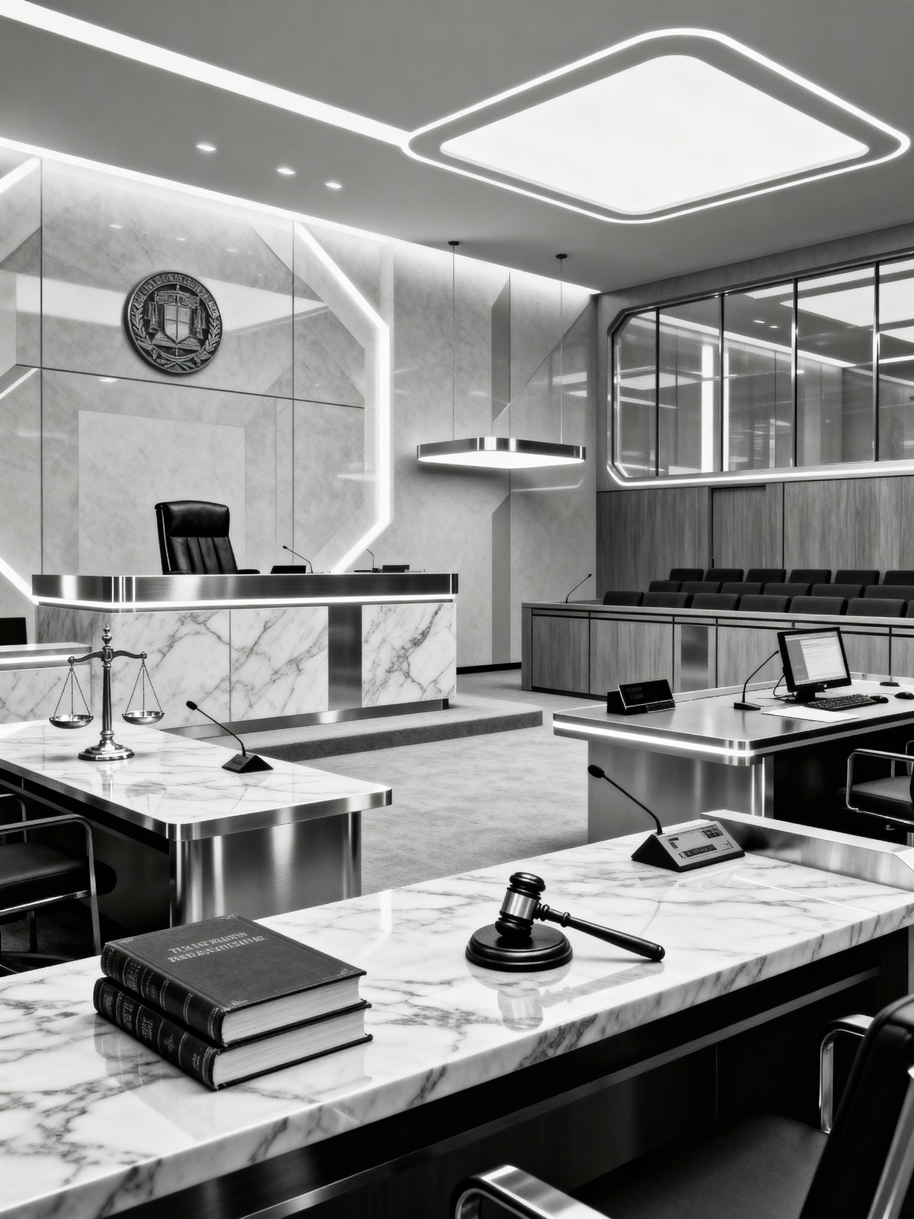 courtroom with retro futuristic style with witness stand and legal books and judge bench and attorney tables and scales of justice and court reporter desk and jury box and gavel. . with monochromatic palette and strong geometric walls and neutral background and bright accents and smooth polished marble and steel finishing and floating surfaces and smooth marble and glass panes