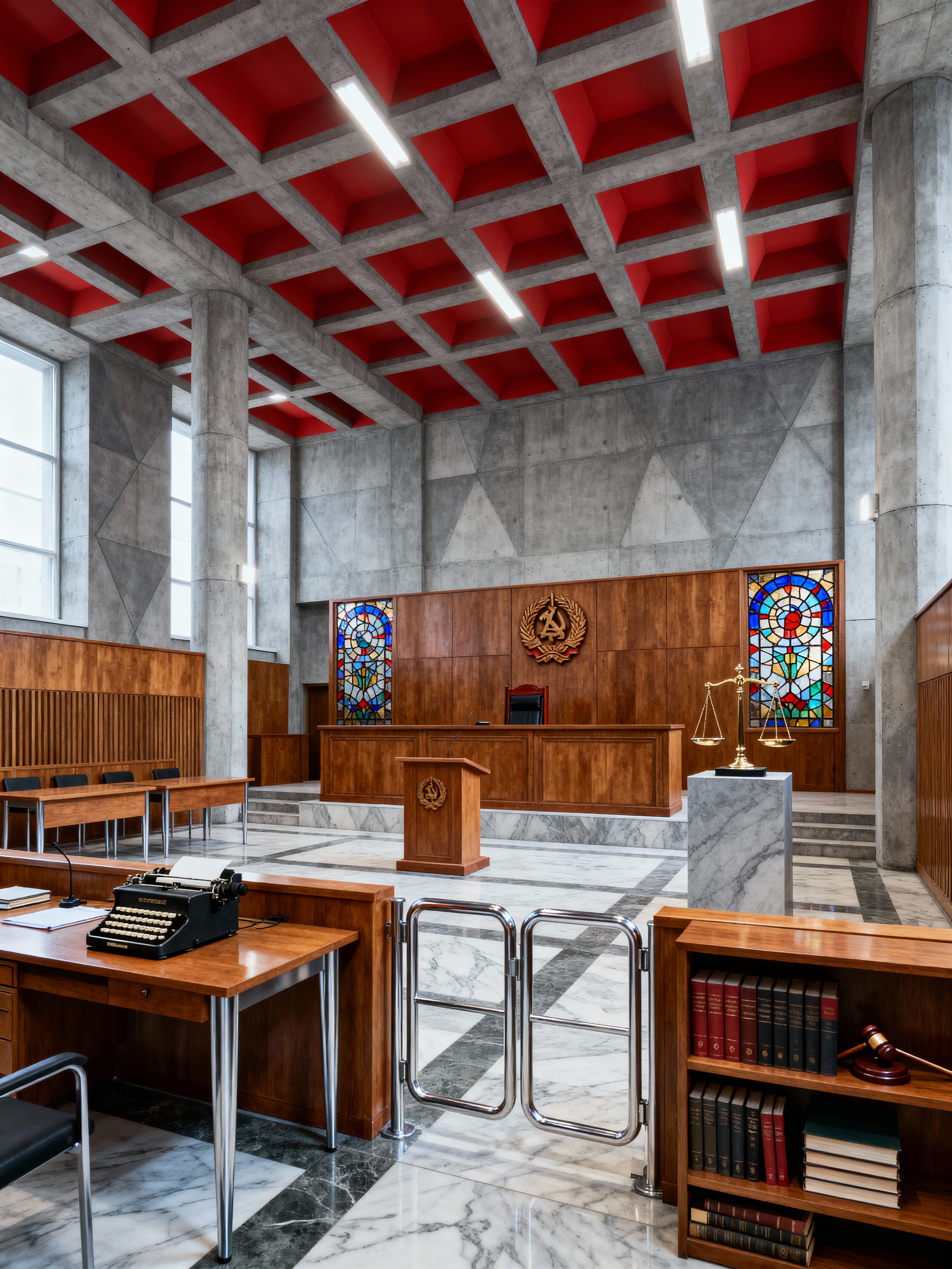 courtroom with soviet style with judge bench and jury box and attorney tables and legal books and court reporter desk and witness stand and gavel and scales of justice. . with monumental scale and austere aesthetic and communist design and brutalist style and soviet-era architecture and eastern bloc and utilitarian design and institutional look