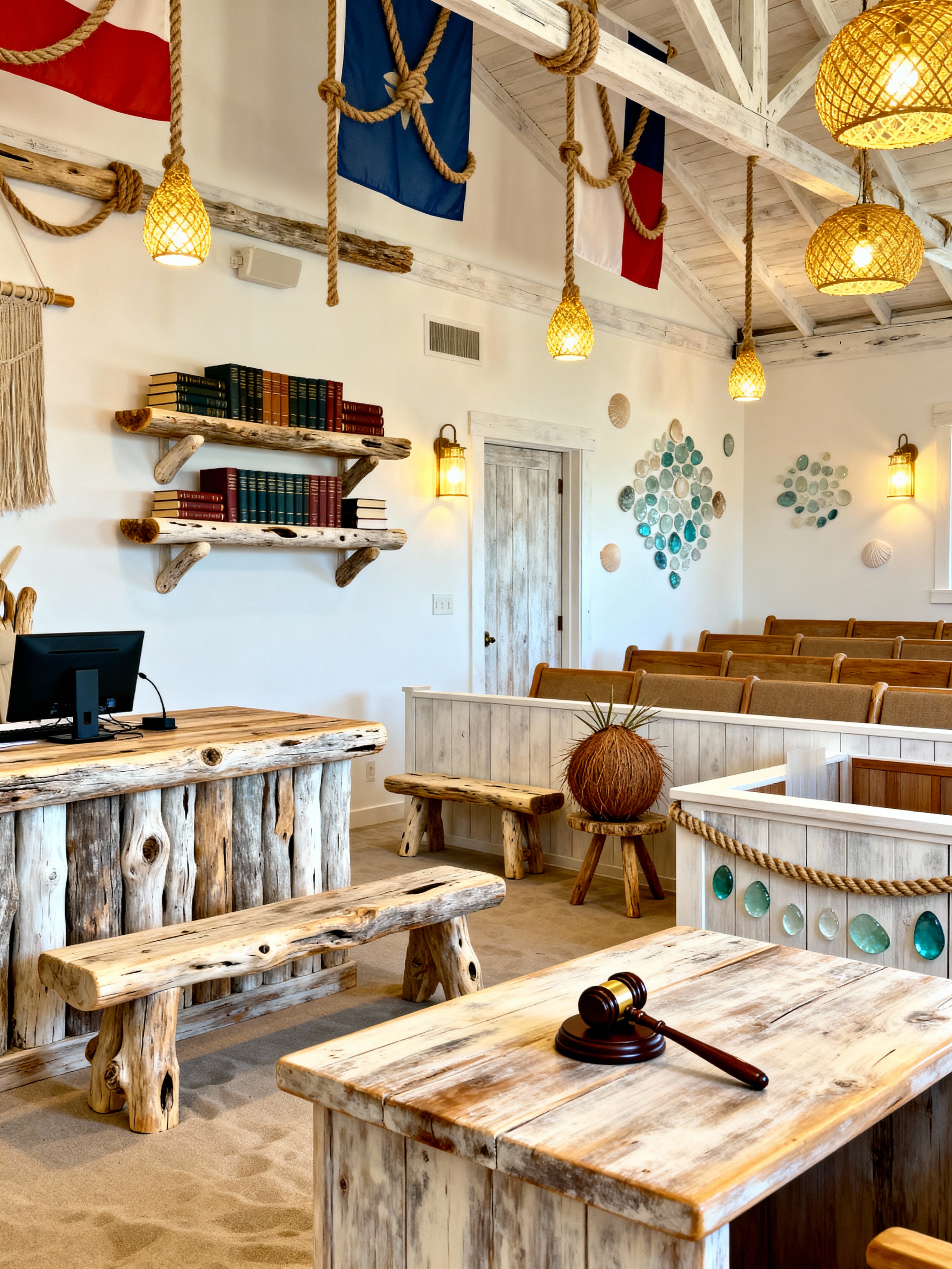 courtroom with surf shack style with court reporter desk and legal books and flags and gallery seating and witness stand and gavel and attorney tables and jury box. . with rope details and white-washed walls and sea glass and coconut decor and sun-bleached wood and coastal lighting and driftwood furniture and weathered wood