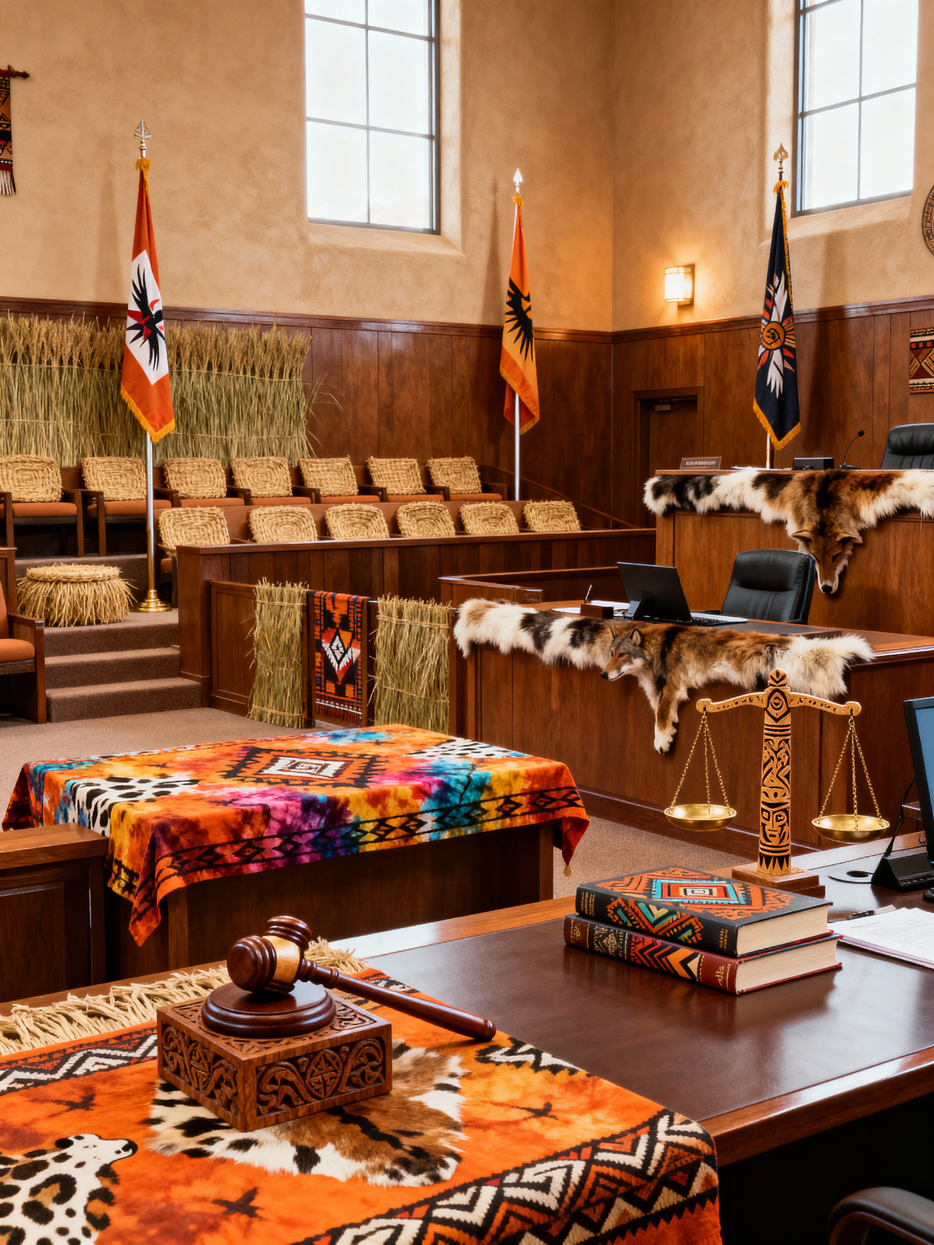 courtroom with tribal style with flags and gallery seating and jury box and court reporter desk and gavel and legal books and scales of justice and attorney tables. . with intricate grass weaving and animal prints and animal furslinen and desert colours and tribal patterns and tribal revival and exuberant splashes of colour and hand dyed batik fabrics