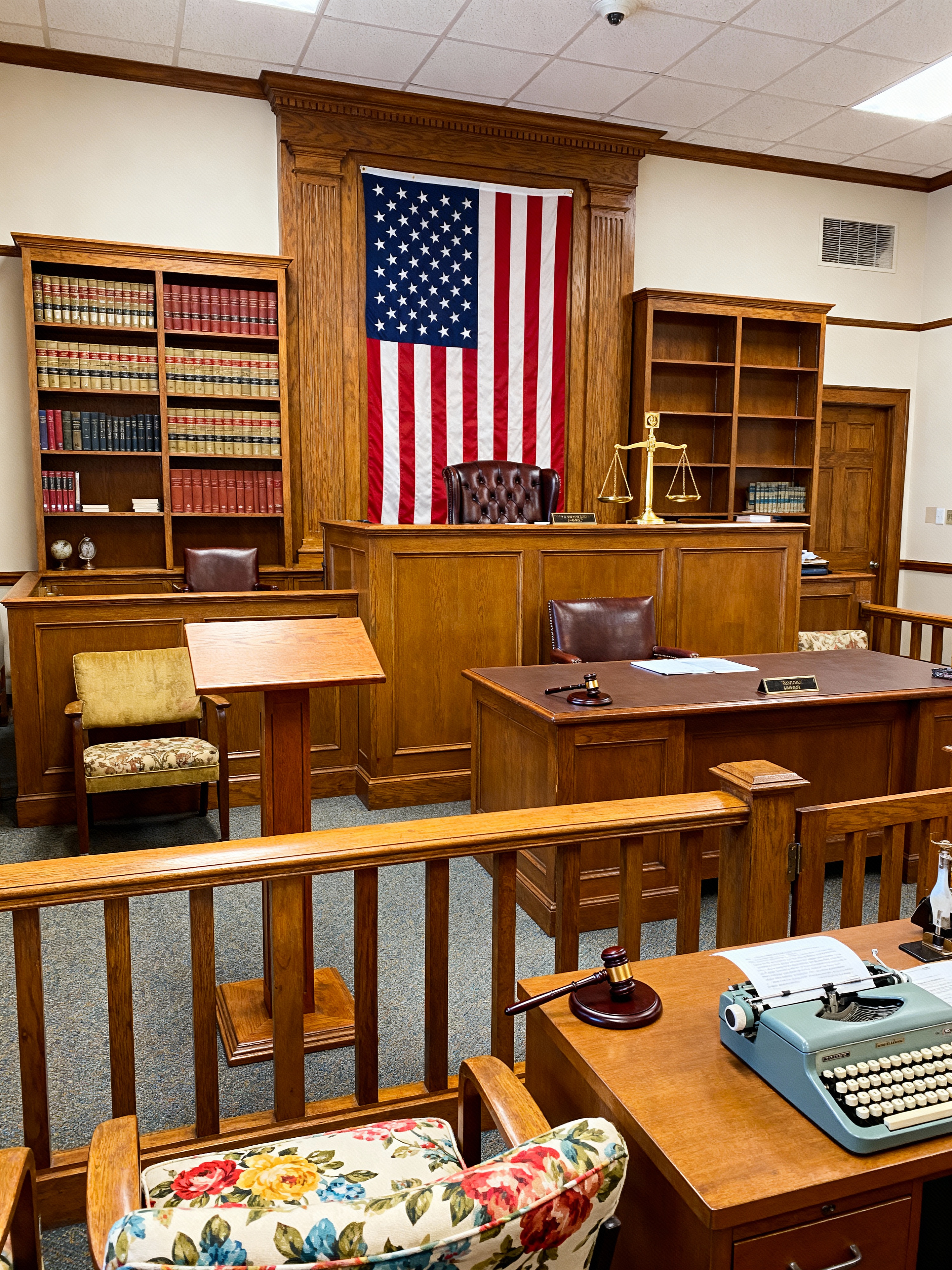 courtroom with vintage style with witness stand and legal books and flags and scales of justice and jury box and gavel and gallery seating and court reporter desk. . with eclectic and timeless pieces and colorful accents and antique decor and upcycled furniture and shabby chic and mid-century and bold patterns