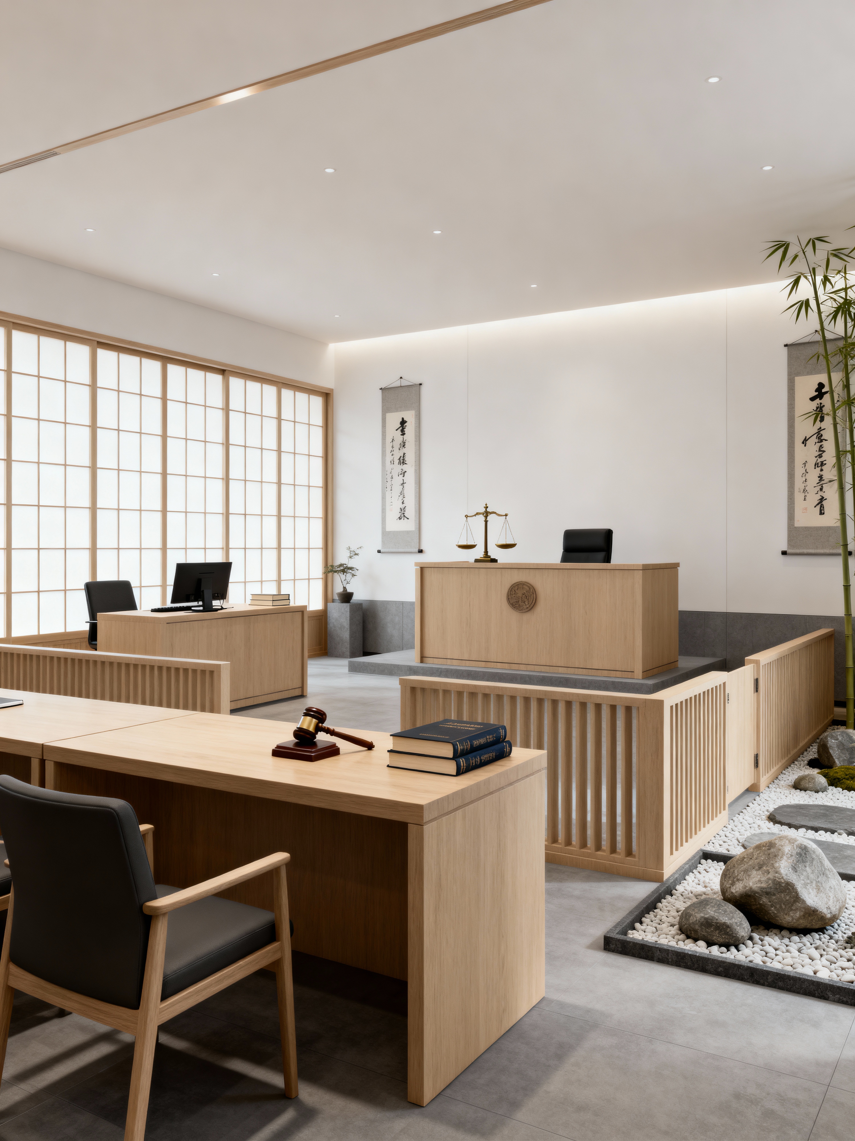 courtroom with zen style with court reporter desk and jury box and witness stand and scales of justice and gavel and attorney tables and gallery seating and legal books. . with asian zen interior and serenity and harmony and japanese interior and asian zen interior and japanese minimalist interior and mimimalist and asian interior and calm and neutral colors