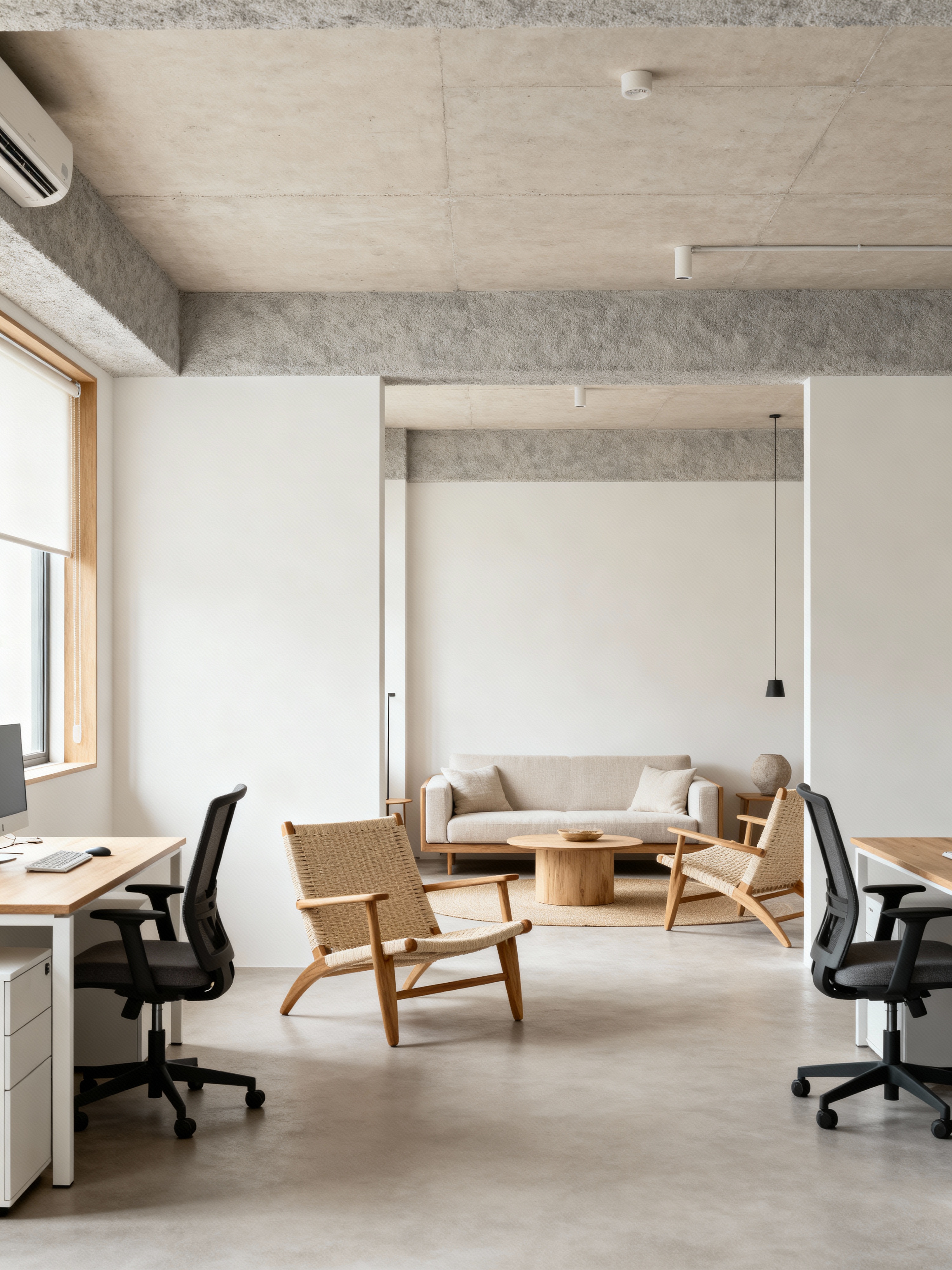 coworking space with airbnb style with office chairs and lounge chairs and seating area with sofa and office desks and office chairs. . with simple color palette and scandinavian style and simple, clean lines and simplistic furniture and practicality and functionality and open and natural lighting and neutral walls and textures and natural materials and elements and simple color palette