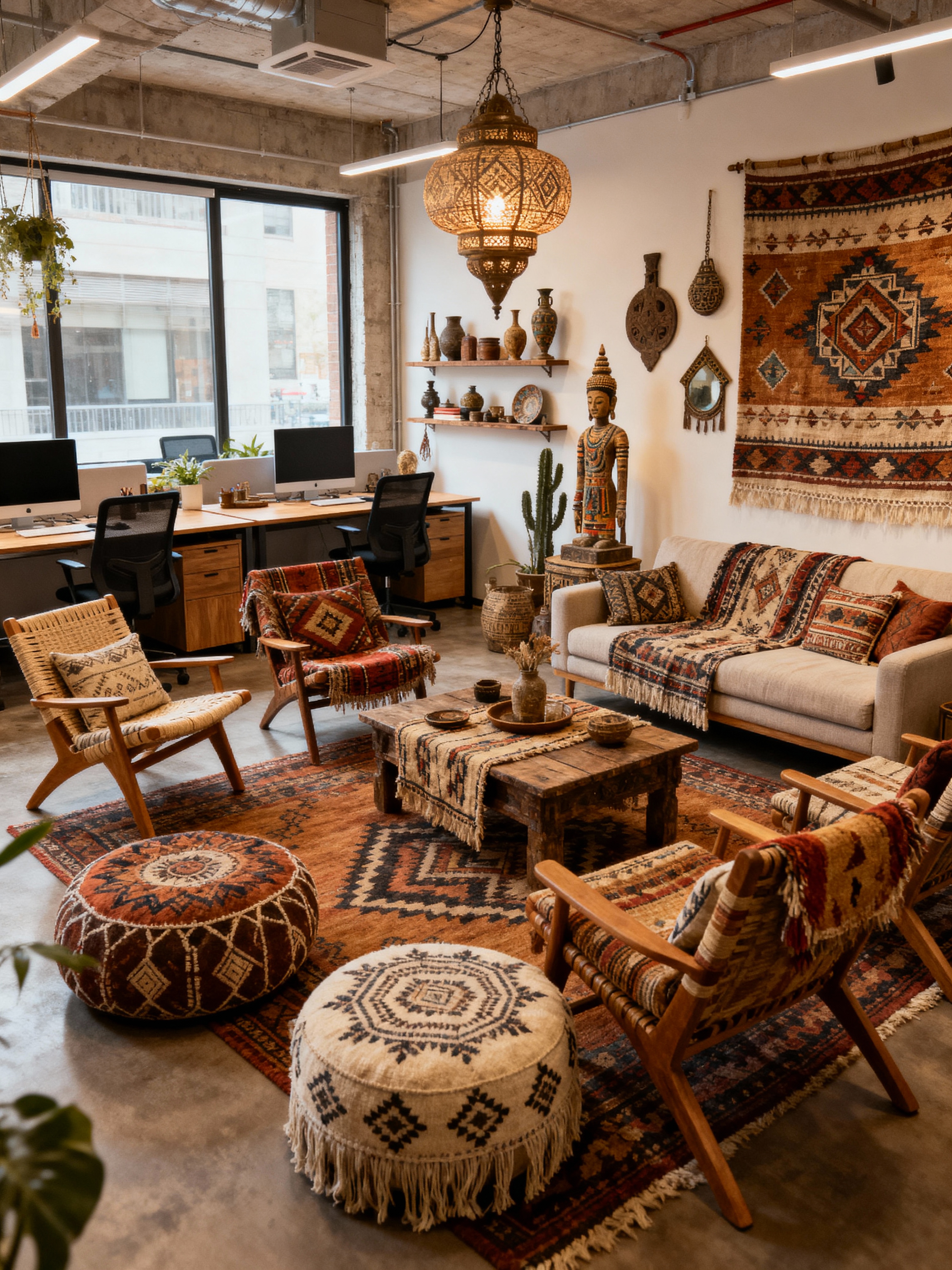 coworking space with boho-chic style with lounge chairs and office desks and office chairs and seating area with sofa and lounge chairs. . with artistic touches and eclectic mix and layered textiles and global artifacts and vintage finds and natural materials and mixed patterns and earthy colors