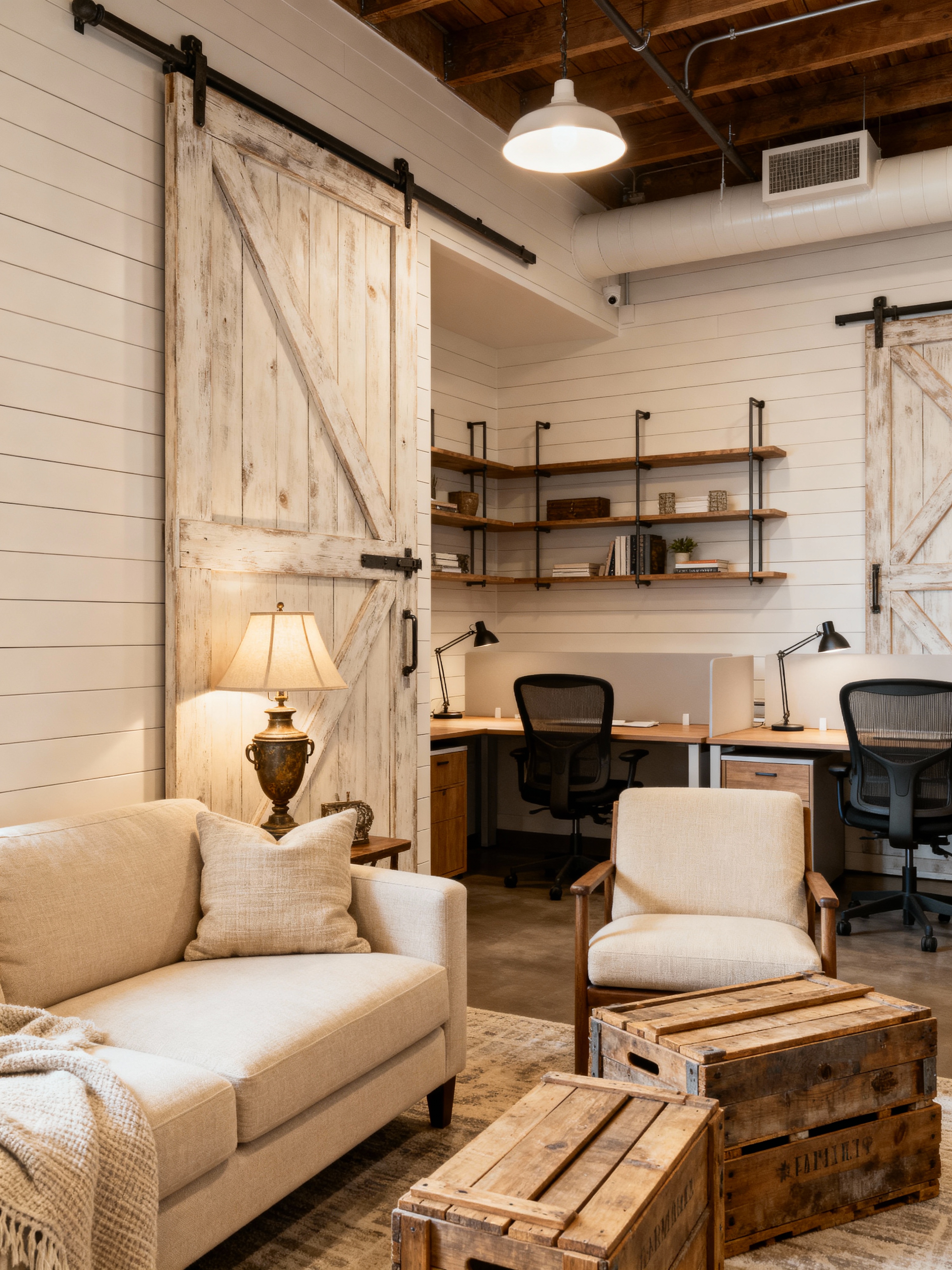 coworking space with farmhouse style with seating area with sofa and office chairs and office desks and lounge chairs and seating area with sofa. . with open shelving and rustic charm and shiplap walls and vintage decor and barn doors and exposed wood and neutral tones and cozy feel