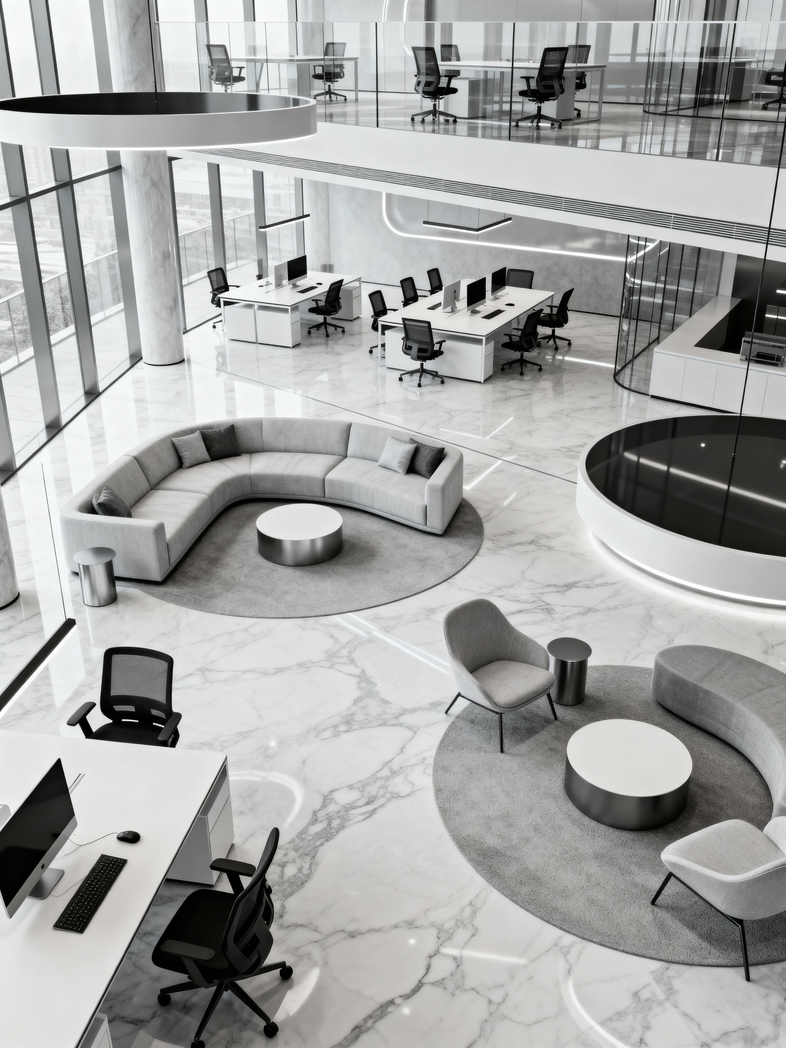 coworking space with futuristic style with seating area with sofa and office chairs and office desks and lounge chairs and seating area with sofa. . with circular shapes and glass panes and smooth marble and light colors and steel finishing and floating surfaces and minimalist clean lines and monochromatic palette