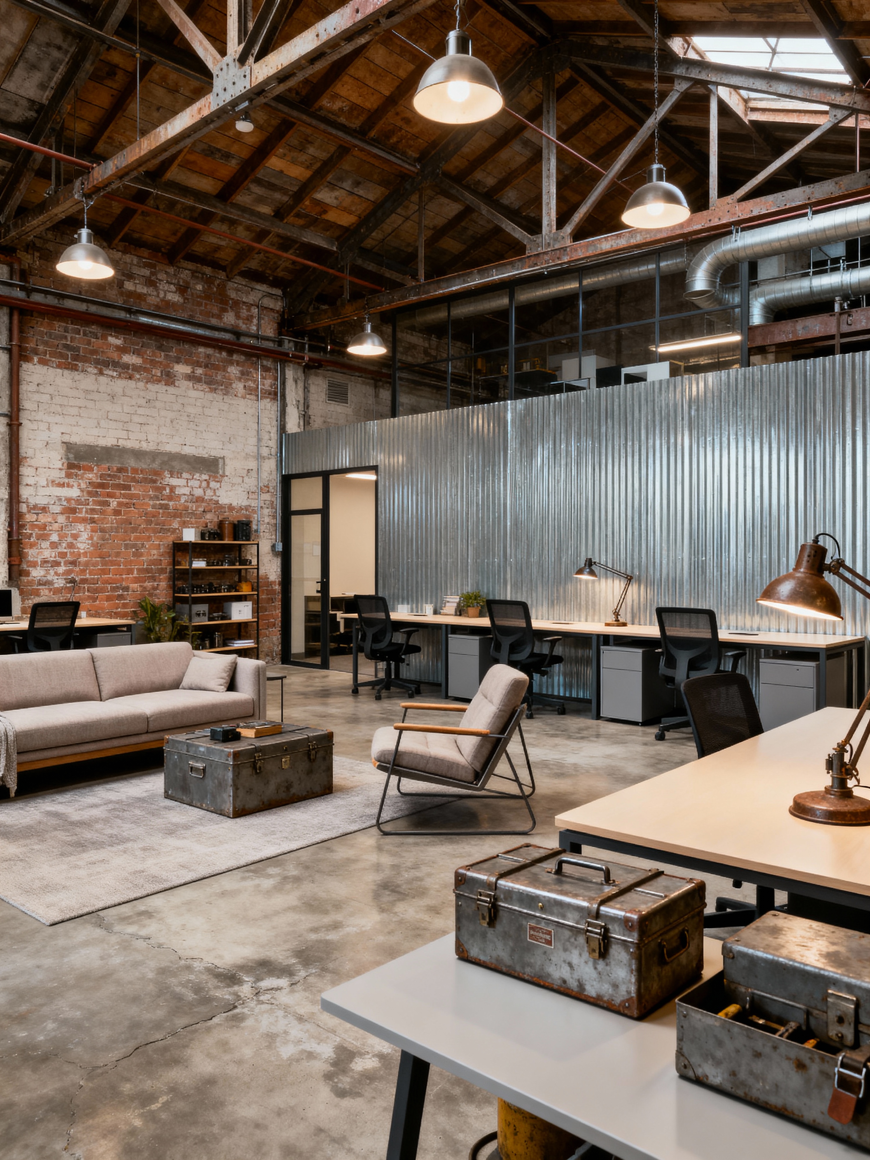 coworking space with industrial style with office chairs and lounge chairs and seating area with sofa and office desks and office chairs. . with exposed rafters and utilitarian objects and neutral tones and exposed brick and open floorplan and exposed concrete and metal panels and factory style