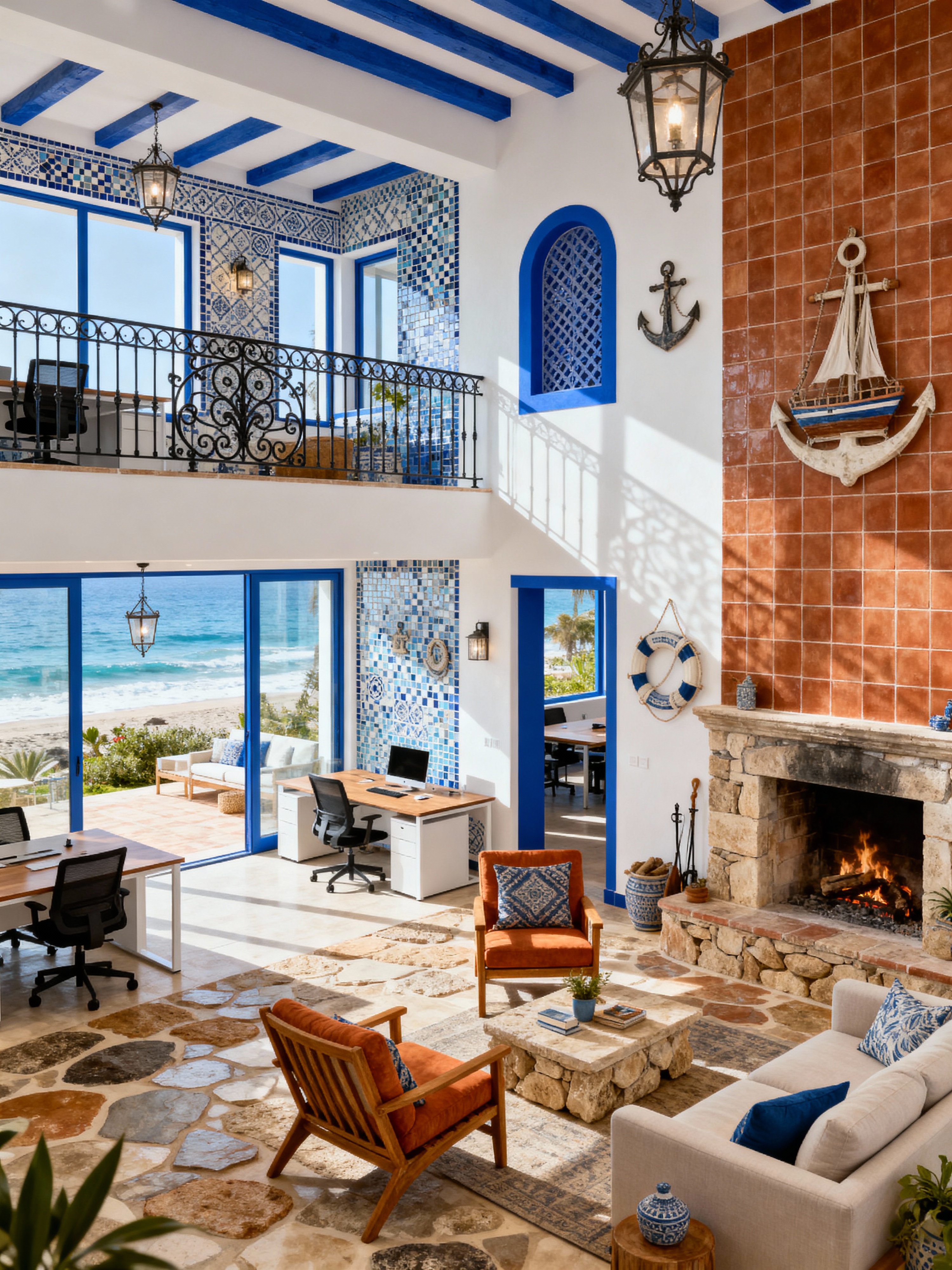 coworking space with mediterranean style with seating area with sofa and lounge chairs and office desks and office chairs and seating area with sofa. . with mosaic patterns and coastal influence and wrought iron and outdoor living and blue and white and stone accents and terracotta tiles and warm earth tones