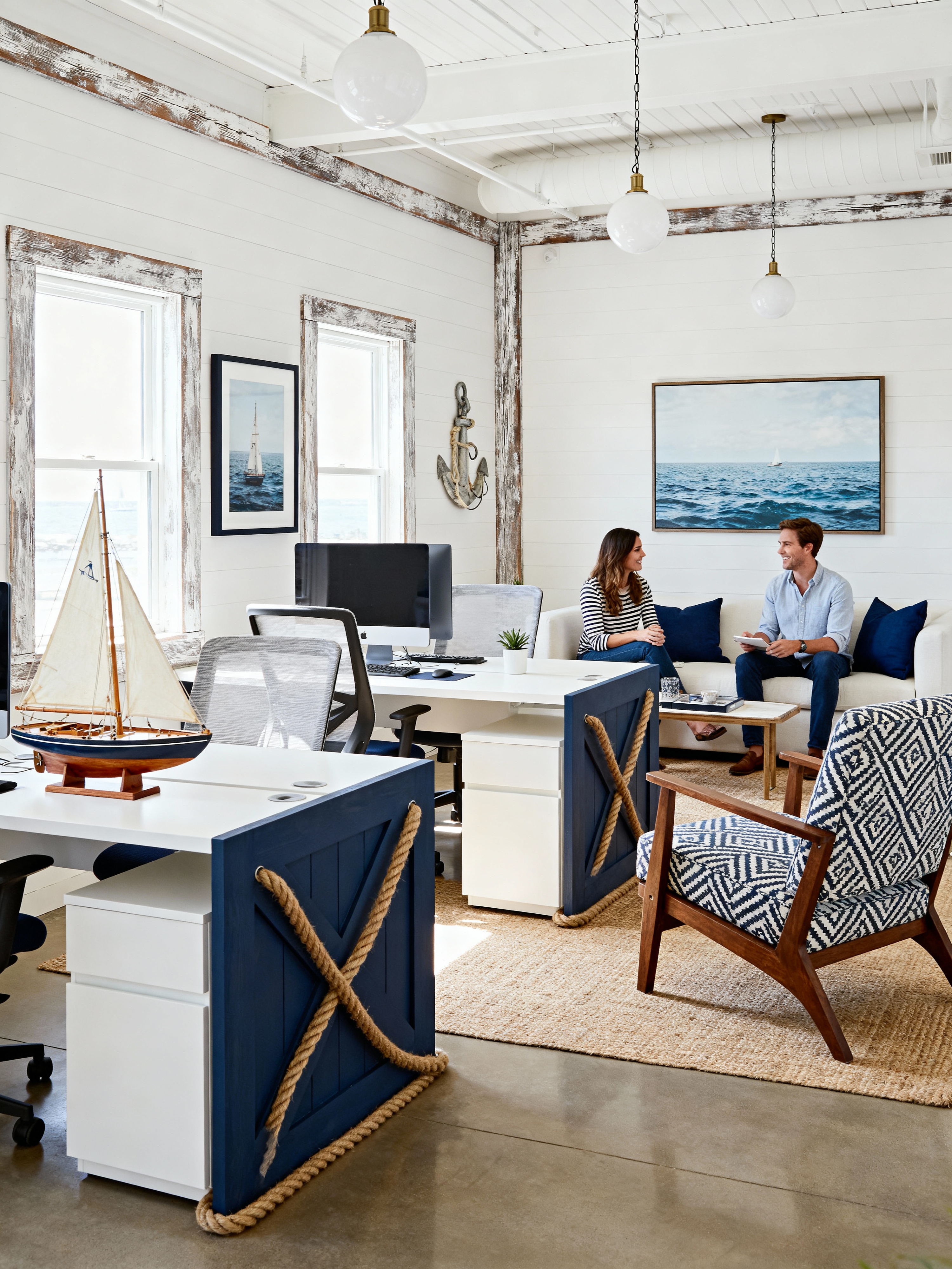 coworking space with nautical style with office desks and office chairs and lounge chairs and seating area with sofa and office desks. . with weathered wood and crisp white and coastal vibes and ocean inspiration and seaside charm and sailboat elements and rope details and navy blue