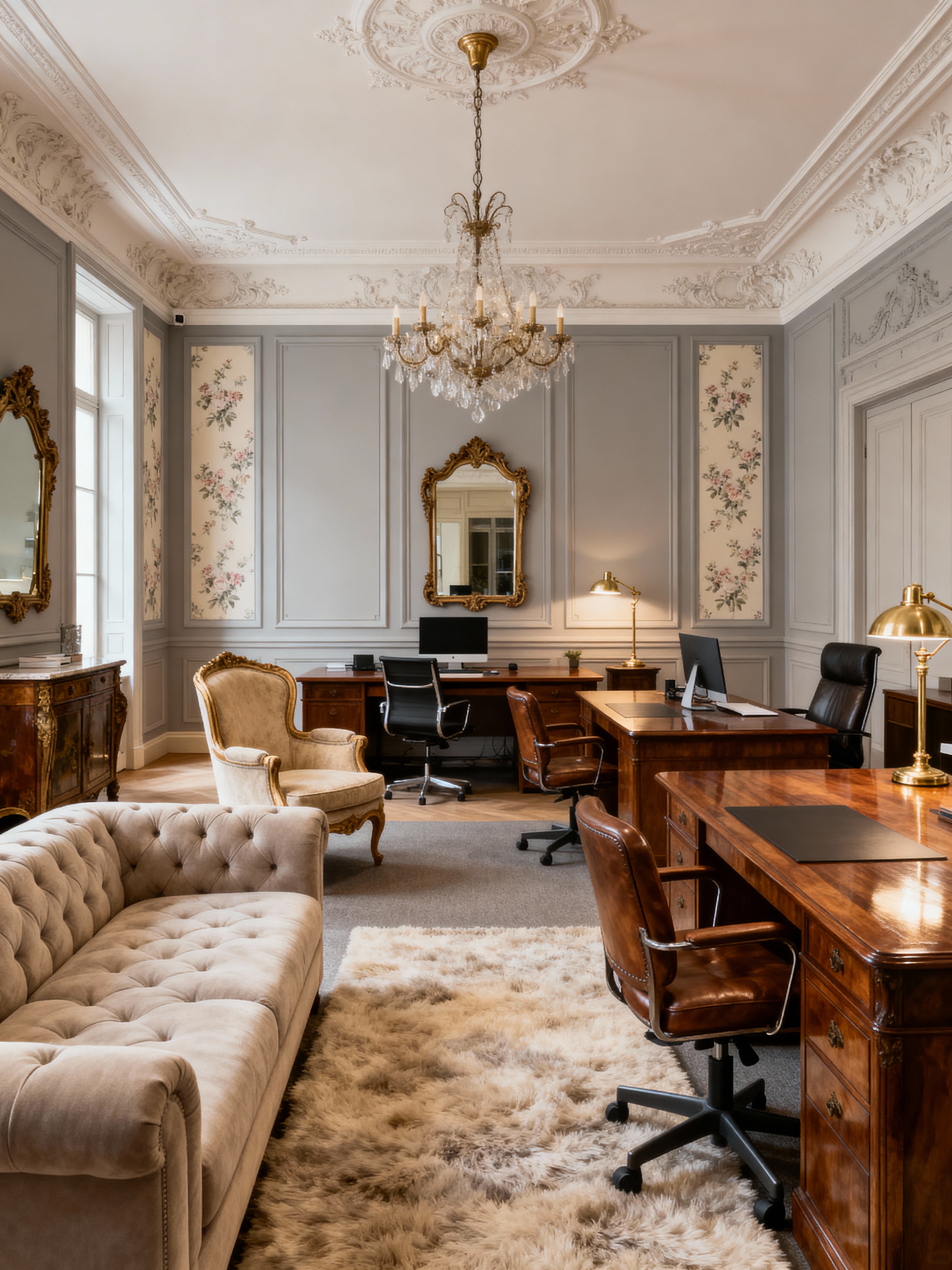 coworking space with parisian style with seating area with sofa and lounge chairs and office desks and office chairs and seating area with sofa. . with french elegance and sophisticated charm and antique furniture and ornate moldings and refined style and neutral palette and timeless beauty and vintage pieces