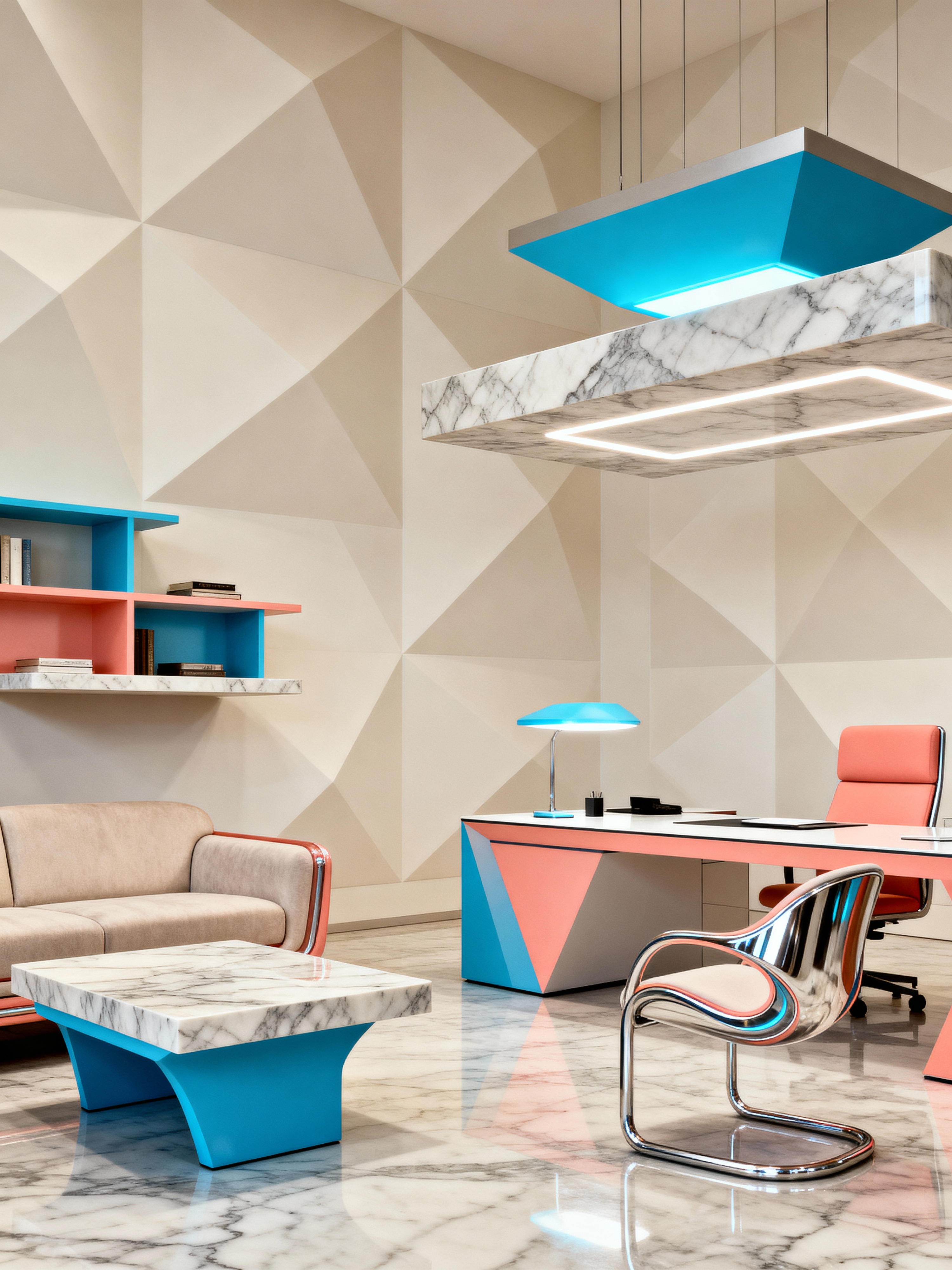 coworking space with retro futuristic style with seating area with sofa and office desks and office chairs and lounge chairs and seating area with sofa. . with strong geometric walls and neutral background and bright accents and light colors and smooth marble and vintage futurism and futuristic interior and smooth polished marble and floating surfaces
