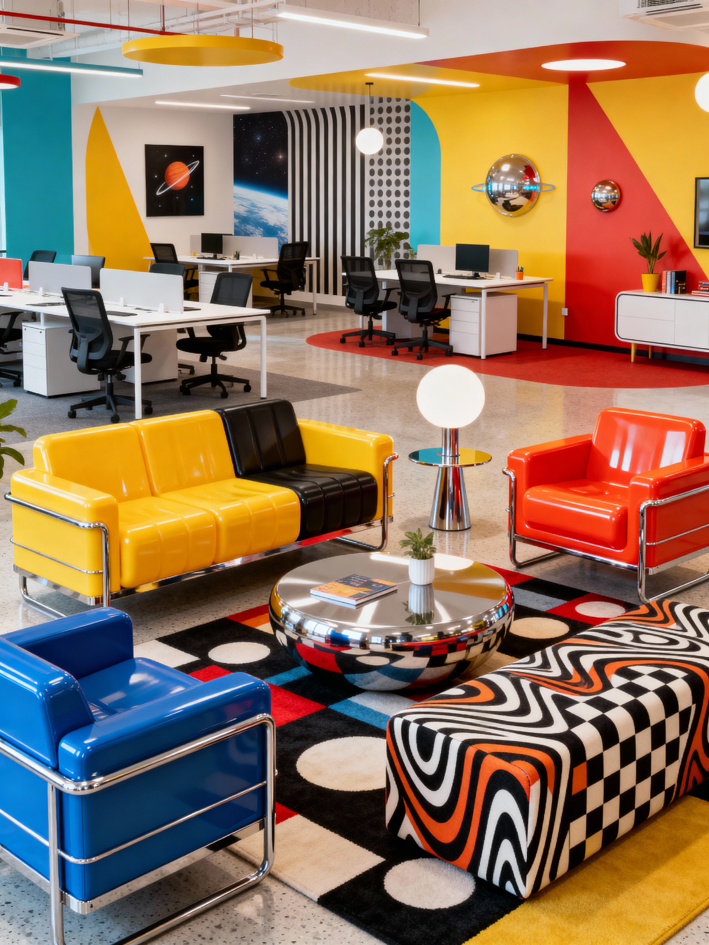 coworking space with retro style with seating area with sofa and lounge chairs and office chairs and office desks and seating area with sofa. . with bright colors and geometric shapes and space age and mod style and nostalgic pieces and plastic furniture and bold patterns and chrome accents
