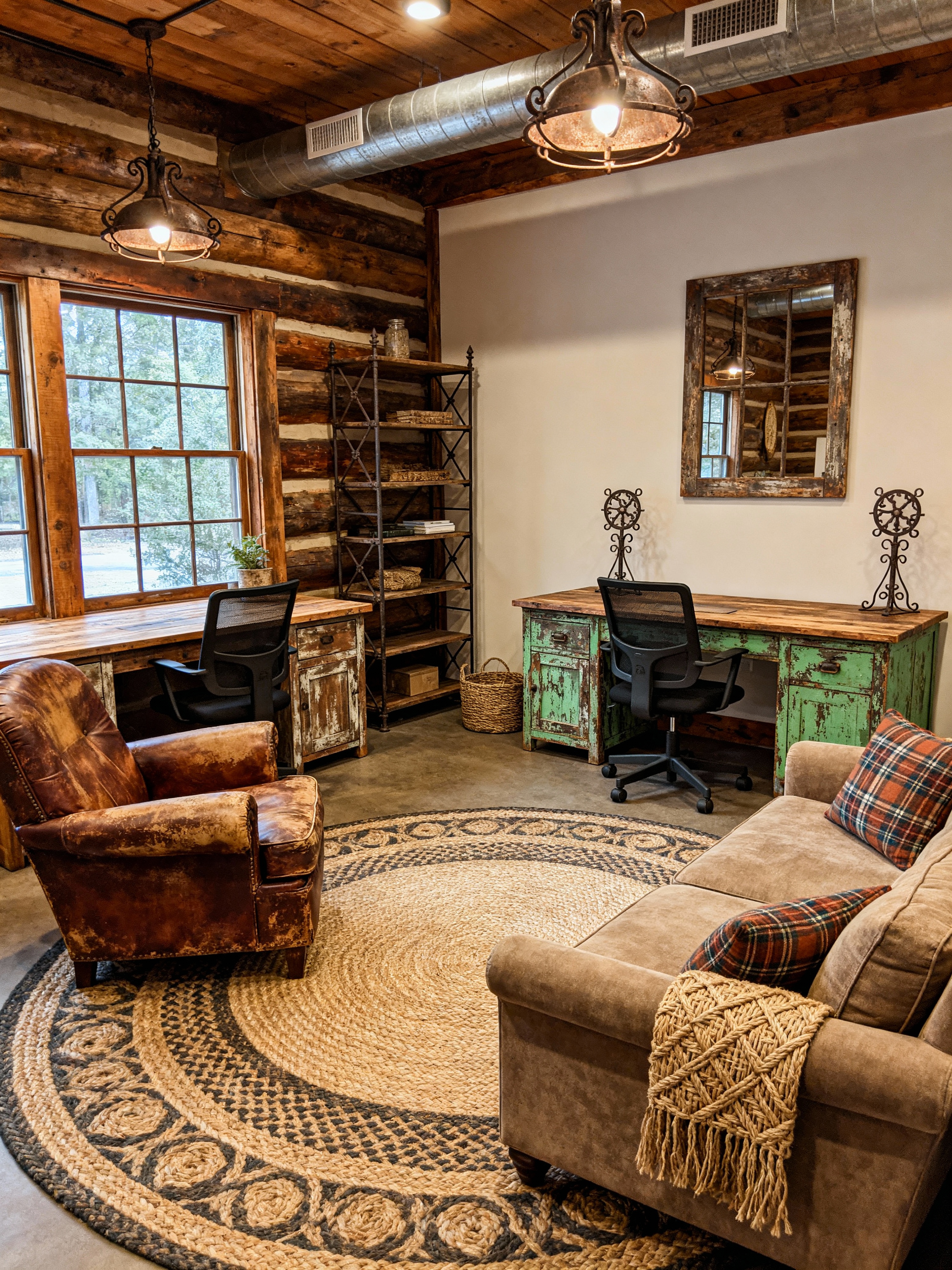 coworking space with rustic style with office chairs and lounge chairs and office desks and seating area with sofa and office chairs. . with vintage decor and woven textures and distressed finishes and earthy tones and cozy cabin and country style and warmth and iron fixtures