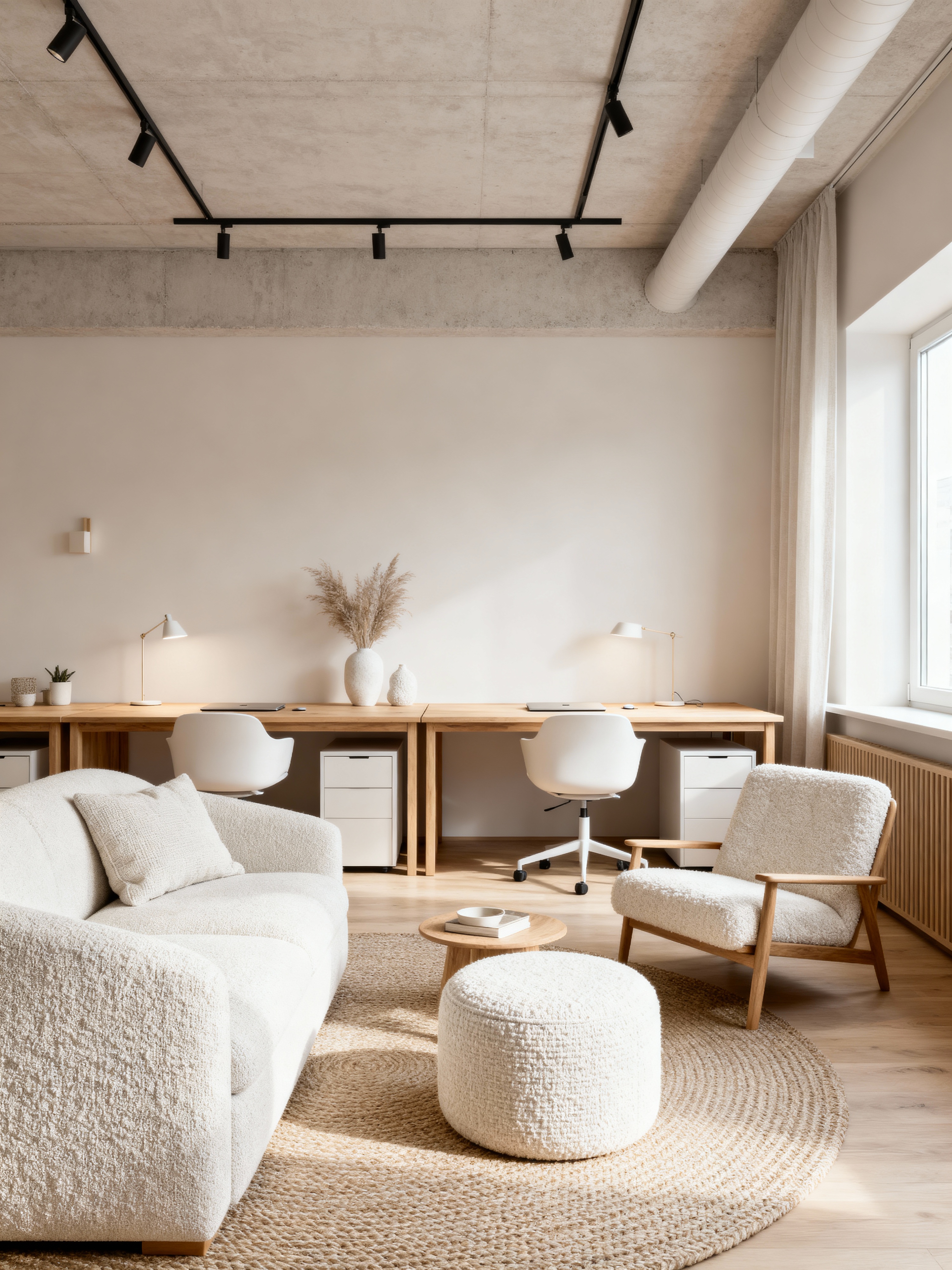 coworking space with scandinavian style with office chairs and seating area with sofa and lounge chairs and office desks and office chairs. . with neutral palette and light wood and white decor and hygge and minimalist design and textured fabrics and clean lines and natural light
