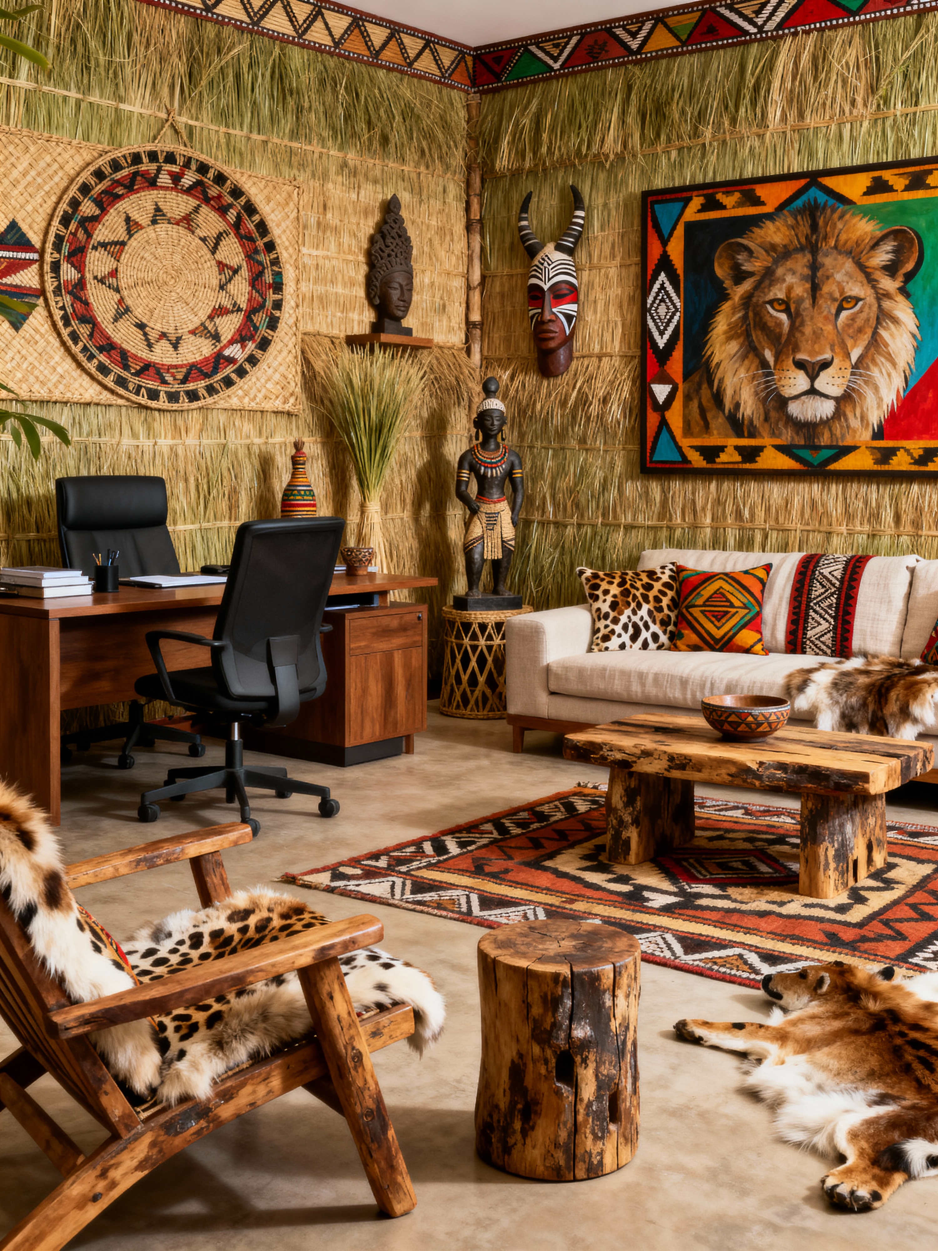 coworking space with tribal style with lounge chairs and office chairs and seating area with sofa and office desks and lounge chairs. . with sculptures and artworks and animal prints and exuberant splashes of colour and tribal revival and intricate grass weaving and smooth worn timbers and tribal patterns and animal furslinen