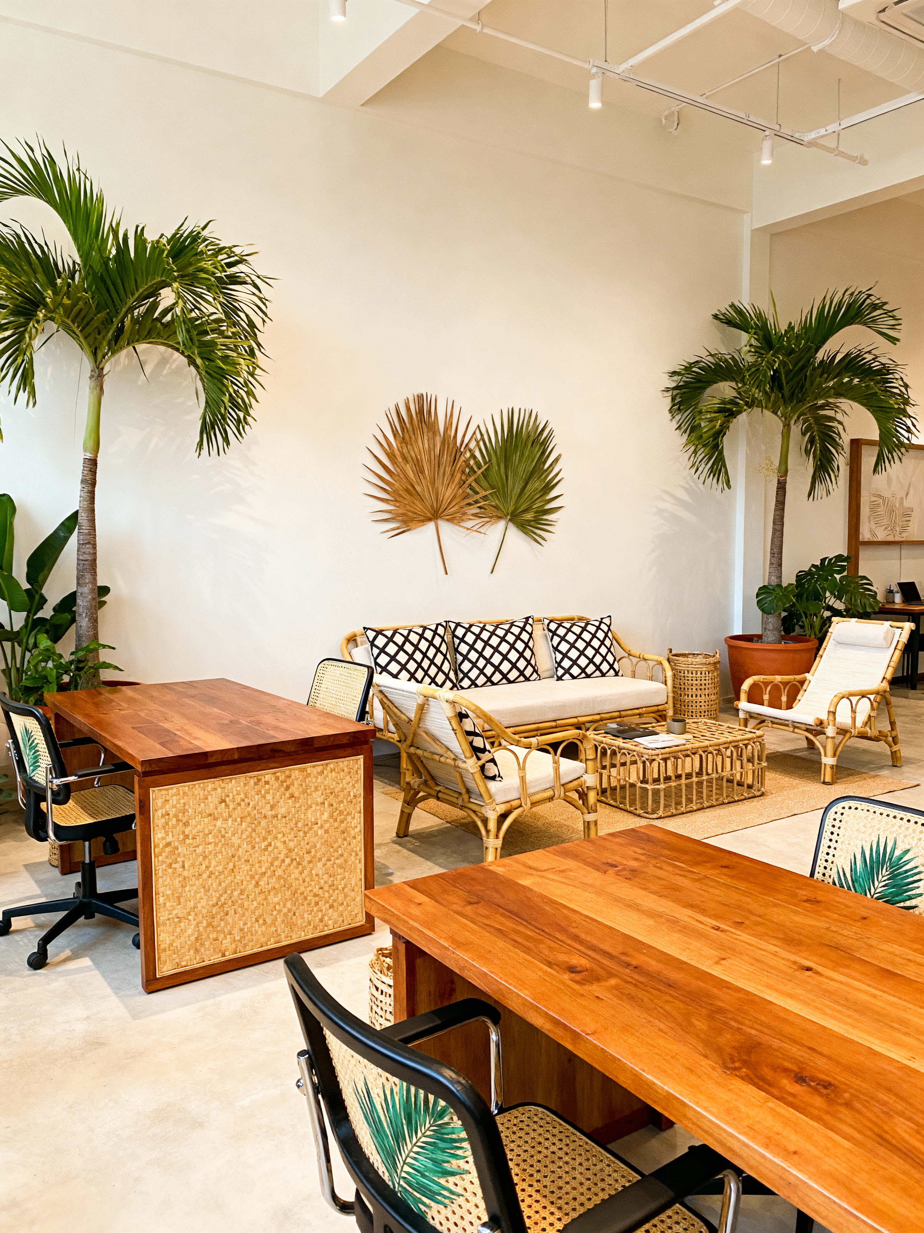 coworking space with tropical style with office desks and seating area with sofa and lounge chairs and office chairs and office desks. . with teak and wicker and lattice prints and palm trees and rattan and bamboo and cane motifs and palm leaves