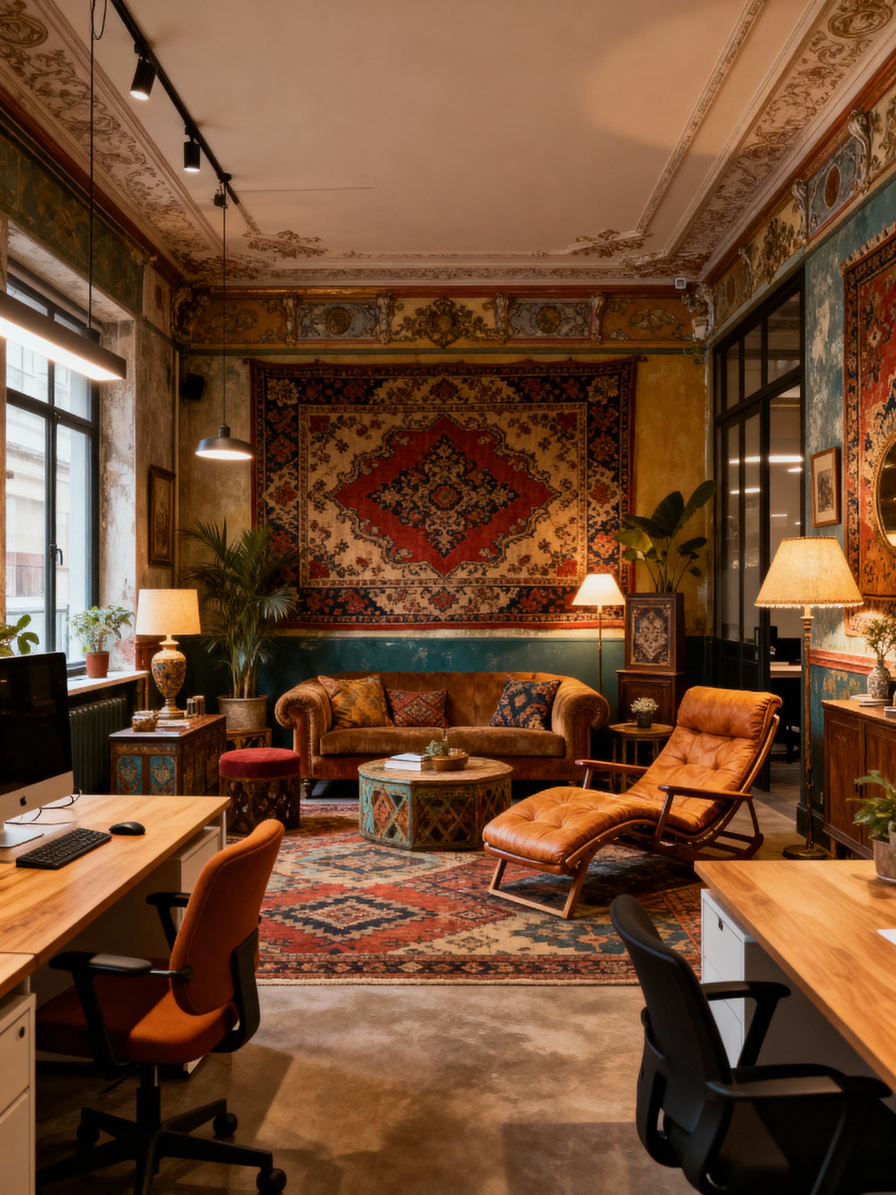 coworking space with vintage style with lounge chairs and office desks and office chairs and seating area with sofa and lounge chairs. . with nostalgic feel and eclectic and ornate details and bold patterns and mid-century and antique decor and timeless pieces and upcycled furniture