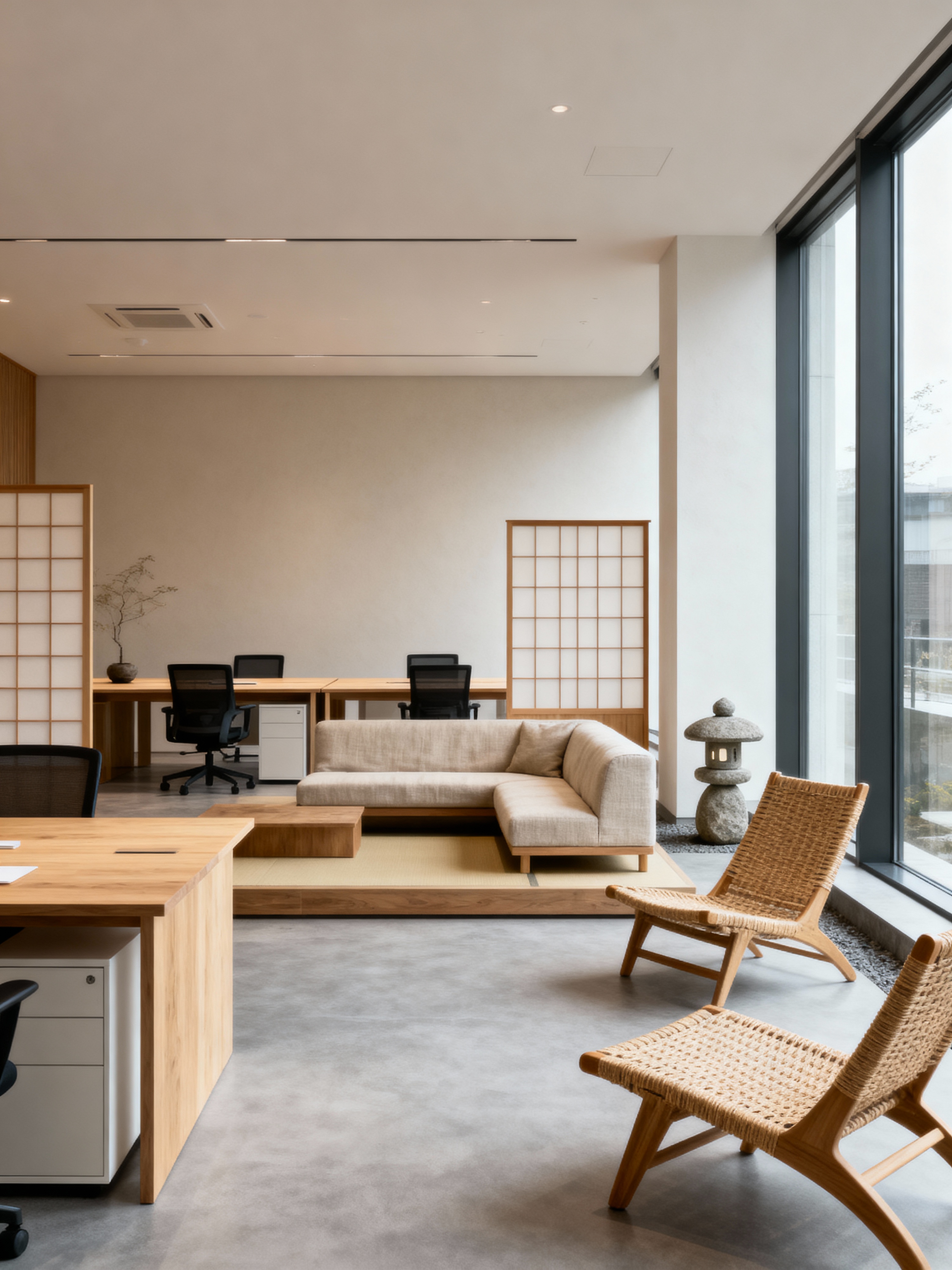 coworking space with zen style with office desks and seating area with sofa and office chairs and lounge chairs and office desks. . with natural textures and asian interior and clutter free and mimimalist and japanese minimalist interior and serenity and harmony and japanese minimalist interior and calm and neutral colors