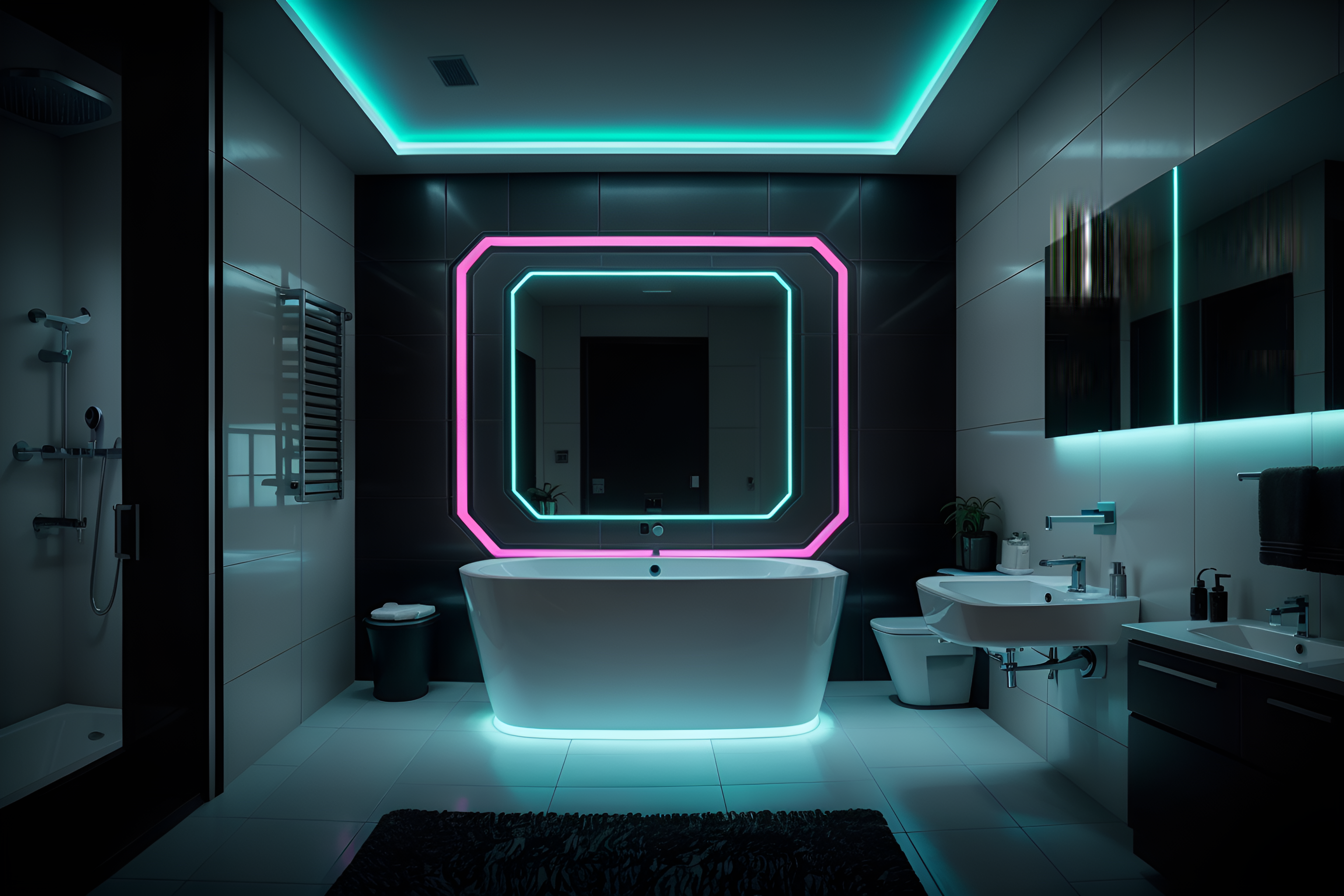 Photo from Pinterest of Cyberpunk-style interior designed bath room home interior With synthwave and led lights and surrealist paintings and military uniforms and gear and color lights glow and clean straight square lines and bladerunner lights and futuristic cybernetic city. With mirror and bathroom sink with faucet and bathtub and waste basket and toilet seat and bath towel and plant and bathroom cabinet and bath rail and shower. Cinematic photo, highly detailed, cinematic lighting, ultra-detailed, ultrarealistic, photorealism, 8k. Trending on Pinterest. Cyberpunk interior design style