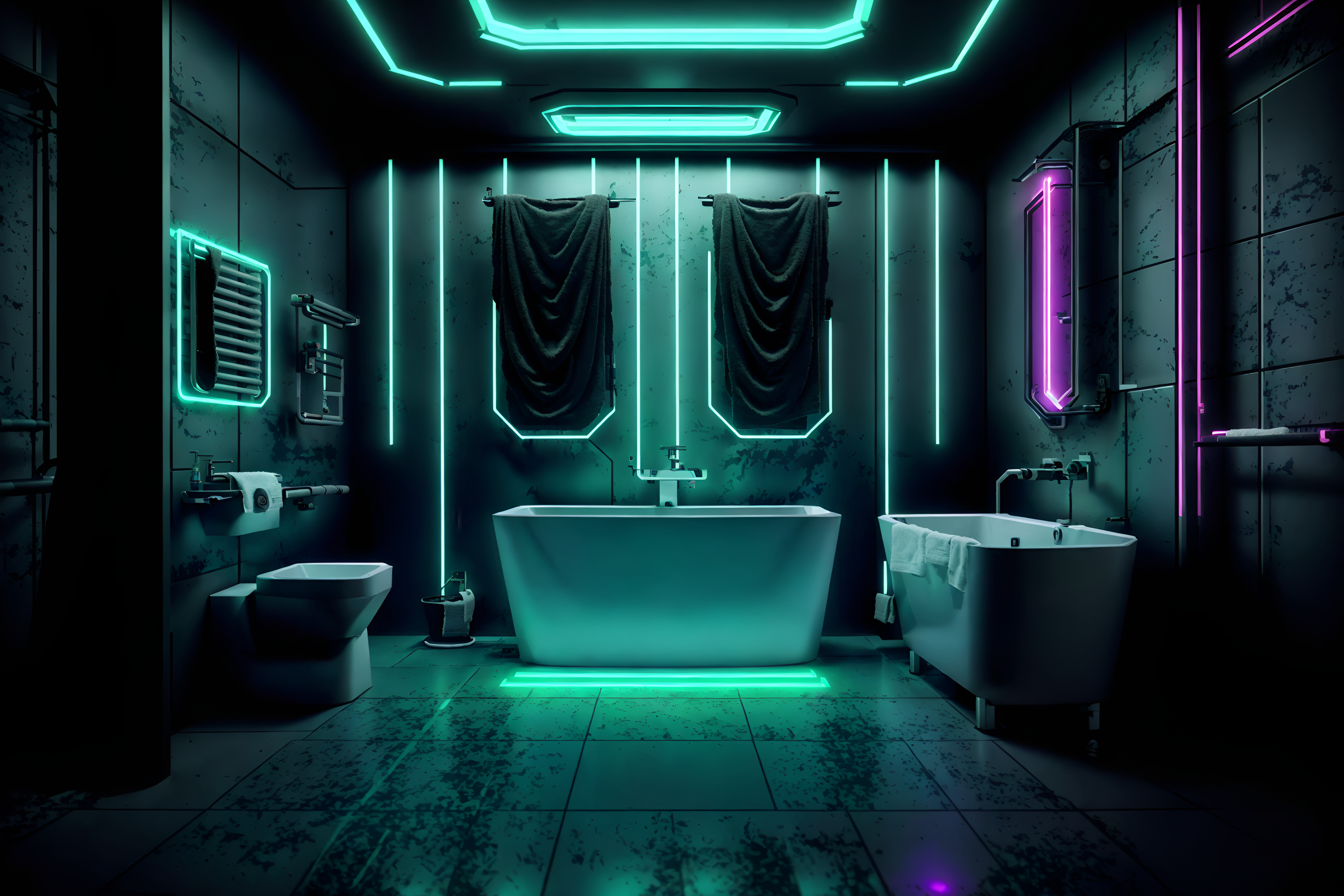 photo from pinterest of cyberpunk-style interior designed (bathroom interior) with bathtub and waste basket and bathroom sink with faucet and bath towel and bath rail and shower and bathroom cabinet and toilet seat. . with led lights and clean straight square lines and military uniforms and gear and futuristic cybernetic city and synthwave and black lights and surrealist paintings and strong geometric walls. . cinematic photo, highly detailed, cinematic lighting, ultra-detailed, ultrarealistic, photorealism, 8k. trending on pinterest. cyberpunk interior design style. masterpiece, cinematic light, ultrarealistic+, photorealistic+, 8k, raw photo, realistic, sharp focus on eyes, (symmetrical eyes), (intact eyes), hyperrealistic, highest quality, best quality, , highly detailed, masterpiece, best quality, extremely detailed 8k wallpaper, masterpiece, best quality, ultra-detailed, best shadow, detailed background, detailed face, detailed eyes, high contrast, best illumination, detailed face, dulux, caustic, dynamic angle, detailed glow. dramatic lighting. highly detailed, insanely detailed hair, symmetrical, intricate details, professionally retouched, 8k high definition. strong bokeh. award winning photo.
