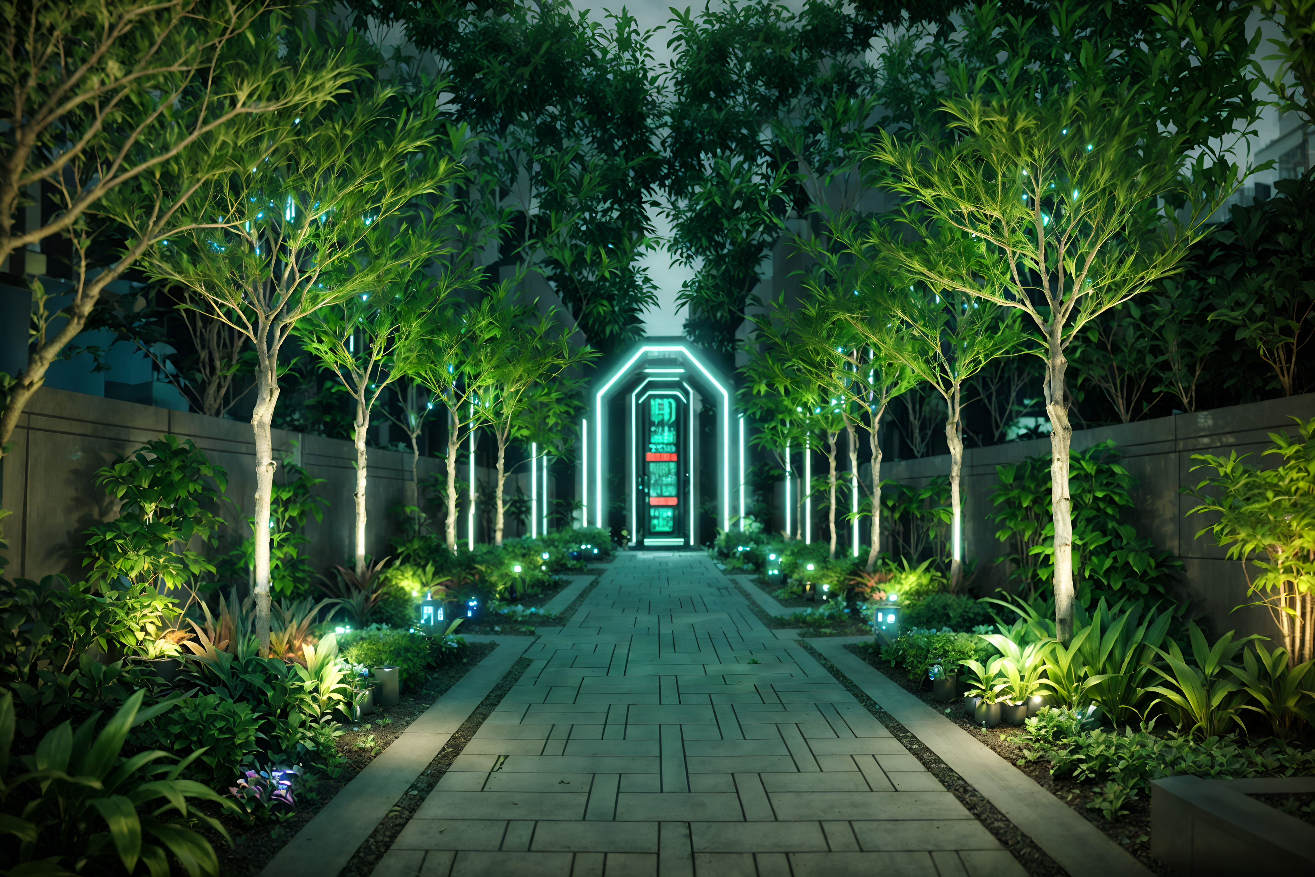 photo from pinterest of cyberpunk-style designed (outdoor garden ) with garden tree and garden plants and grass and garden tree. . with led lights and futuristic cybernetic details and futuristic cybernetic city and clean straight square lines and cyberpunk style and bladerunner style and minimalist and cyberpunk lights. . cinematic photo, highly detailed, cinematic lighting, ultra-detailed, ultrarealistic, photorealism, 8k. trending on pinterest. cyberpunk design style. masterpiece, cinematic light, ultrarealistic+, photorealistic+, 8k, raw photo, realistic, sharp focus on eyes, (symmetrical eyes), (intact eyes), hyperrealistic, highest quality, best quality, , highly detailed, masterpiece, best quality, extremely detailed 8k wallpaper, masterpiece, best quality, ultra-detailed, best shadow, detailed background, detailed face, detailed eyes, high contrast, best illumination, detailed face, dulux, caustic, dynamic angle, detailed glow. dramatic lighting. highly detailed, insanely detailed hair, symmetrical, intricate details, professionally retouched, 8k high definition. strong bokeh. award winning photo.