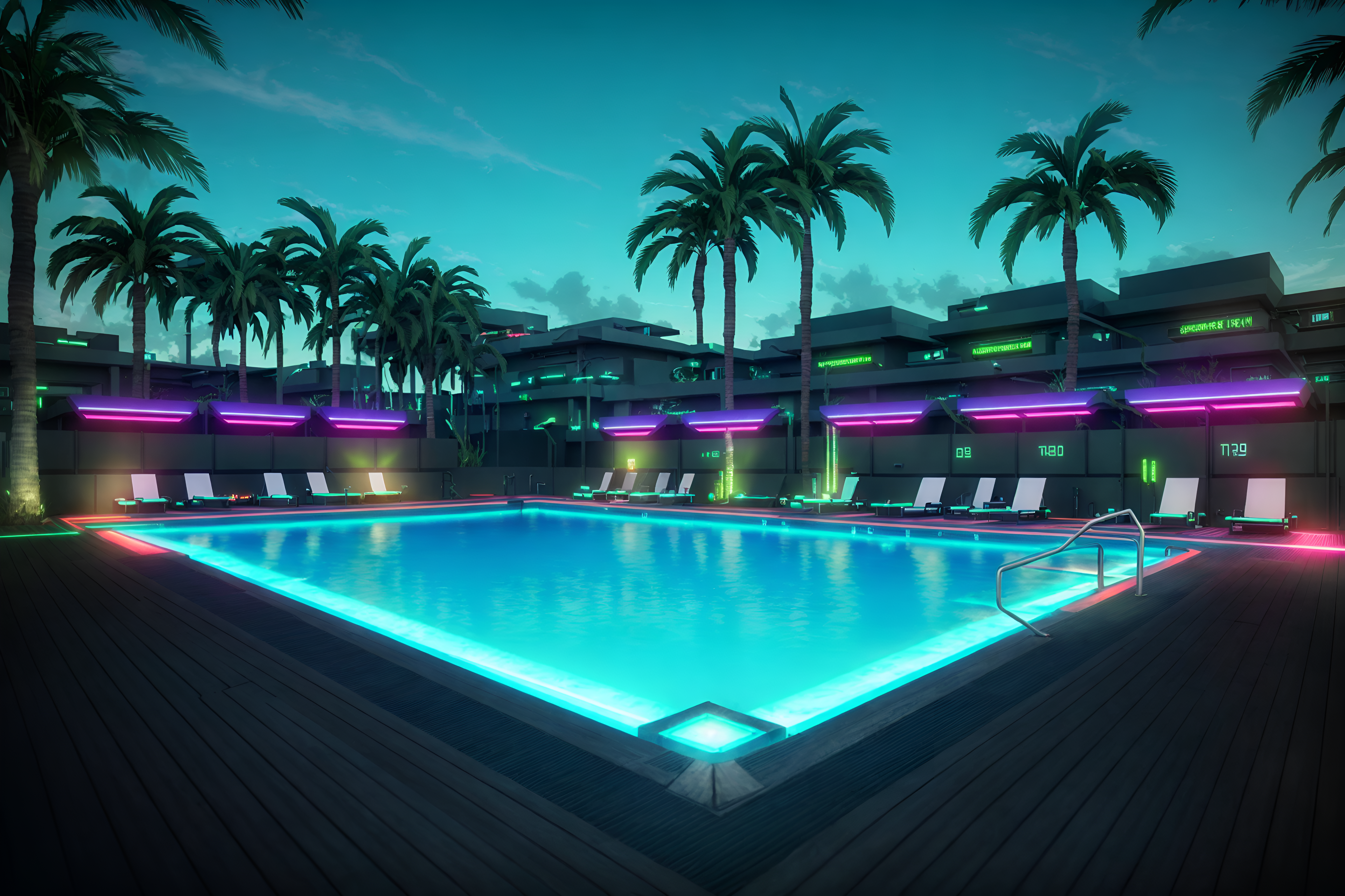 photo from pinterest of cyberpunk-style designed (outdoor pool area ) with pool lounge chairs and pool and pool lights and pool lounge chairs. . with color lights glow and strong geometric walls and cyberpunk style and cyberpunk lights and cyberpunk lights and synthwave and military uniforms and gear and dark night. . cinematic photo, highly detailed, cinematic lighting, ultra-detailed, ultrarealistic, photorealism, 8k. trending on pinterest. cyberpunk design style. masterpiece, cinematic light, ultrarealistic+, photorealistic+, 8k, raw photo, realistic, sharp focus on eyes, (symmetrical eyes), (intact eyes), hyperrealistic, highest quality, best quality, , highly detailed, masterpiece, best quality, extremely detailed 8k wallpaper, masterpiece, best quality, ultra-detailed, best shadow, detailed background, detailed face, detailed eyes, high contrast, best illumination, detailed face, dulux, caustic, dynamic angle, detailed glow. dramatic lighting. highly detailed, insanely detailed hair, symmetrical, intricate details, professionally retouched, 8k high definition. strong bokeh. award winning photo.