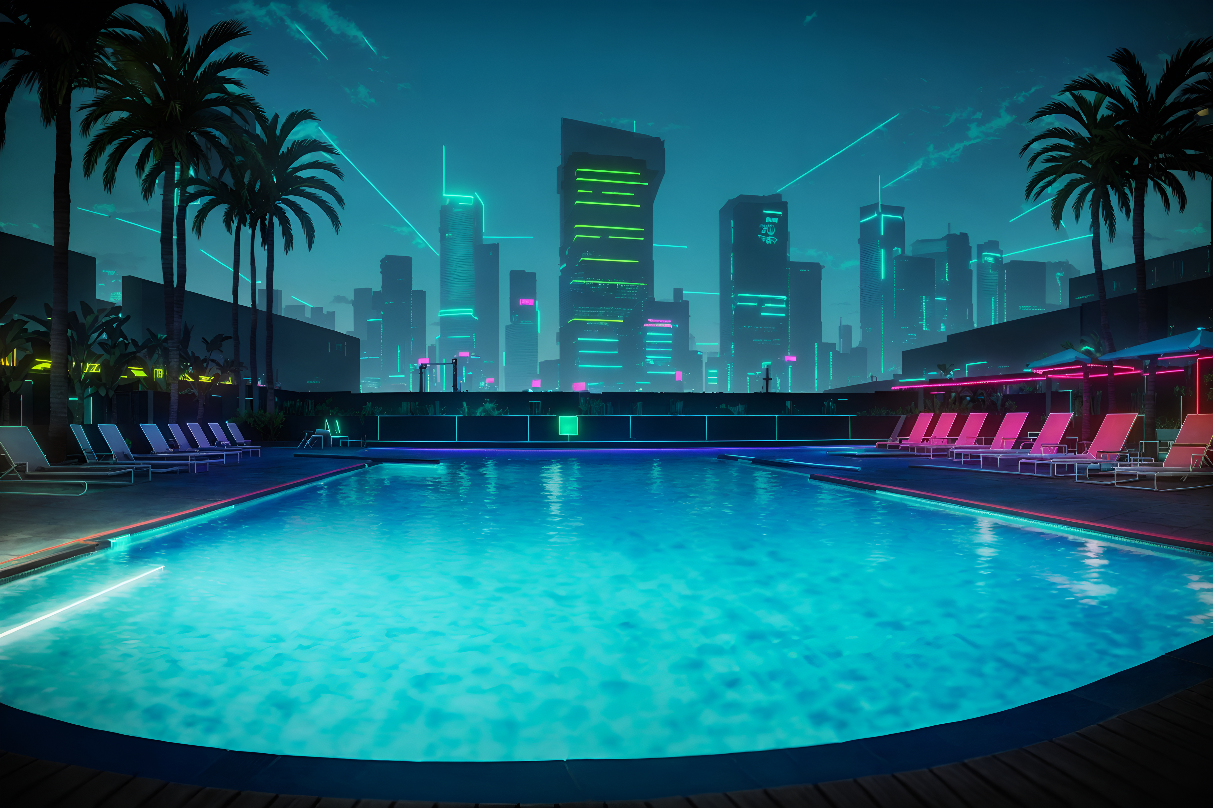 photo from pinterest of cyberpunk-style designed (outdoor pool area ) with pool lounge chairs and pool and pool lights and pool lounge chairs. . with color lights glow and strong geometric walls and cyberpunk style and cyberpunk lights and cyberpunk lights and synthwave and military uniforms and gear and dark night. . cinematic photo, highly detailed, cinematic lighting, ultra-detailed, ultrarealistic, photorealism, 8k. trending on pinterest. cyberpunk design style. masterpiece, cinematic light, ultrarealistic+, photorealistic+, 8k, raw photo, realistic, sharp focus on eyes, (symmetrical eyes), (intact eyes), hyperrealistic, highest quality, best quality, , highly detailed, masterpiece, best quality, extremely detailed 8k wallpaper, masterpiece, best quality, ultra-detailed, best shadow, detailed background, detailed face, detailed eyes, high contrast, best illumination, detailed face, dulux, caustic, dynamic angle, detailed glow. dramatic lighting. highly detailed, insanely detailed hair, symmetrical, intricate details, professionally retouched, 8k high definition. strong bokeh. award winning photo.