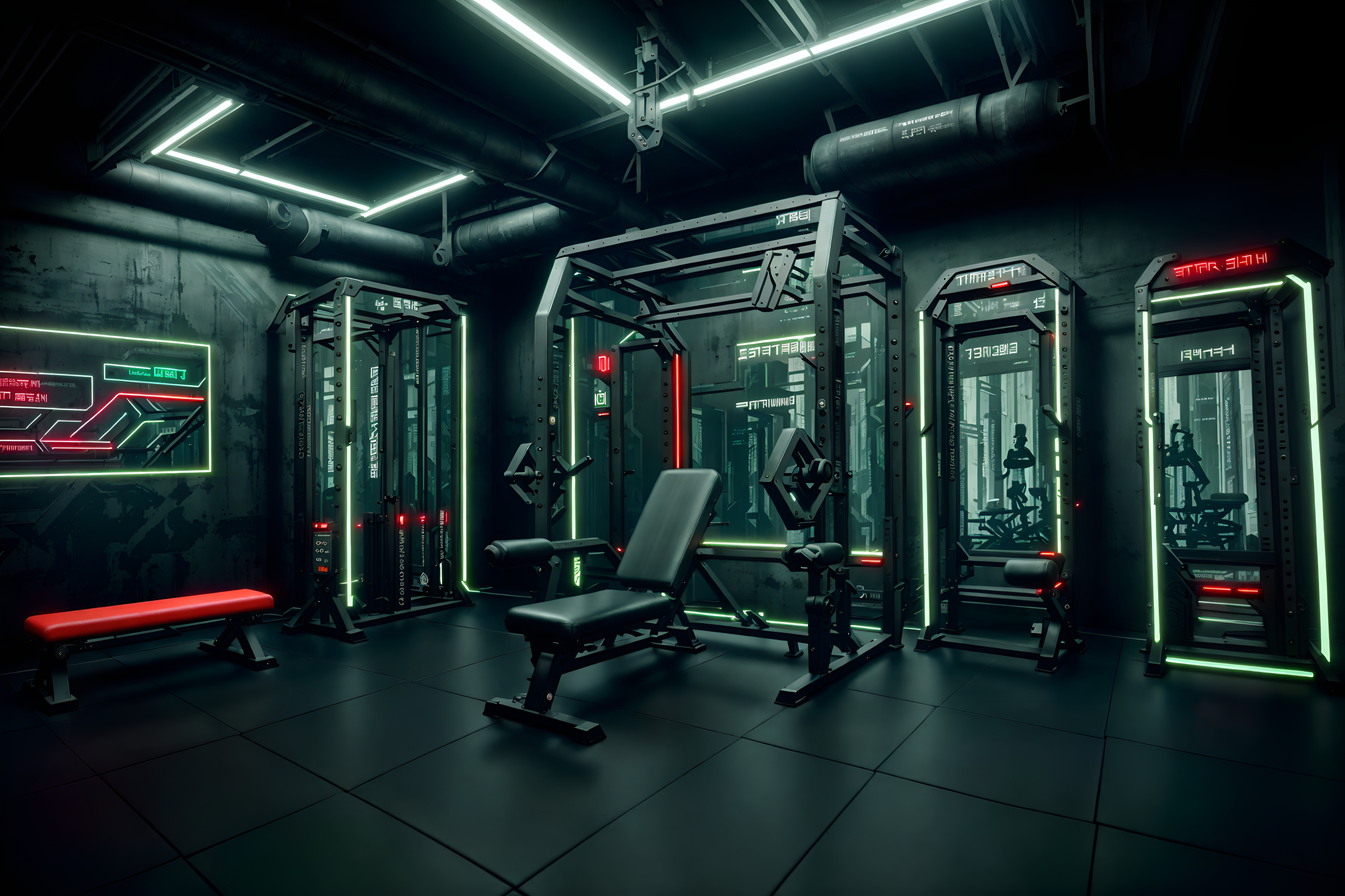 cyberpunk gymsinterior decorate this fitness gym with cyberpunk style. . . with exercise bicycle and dumbbell stand and squat rack and bench press and crosstrainer and exercise bicycle. . with strong geometric walls and surrealist paintings and military uniforms and gear and futuristic cybernetic city and minimalist and black lights and dark night and synthwave. . .