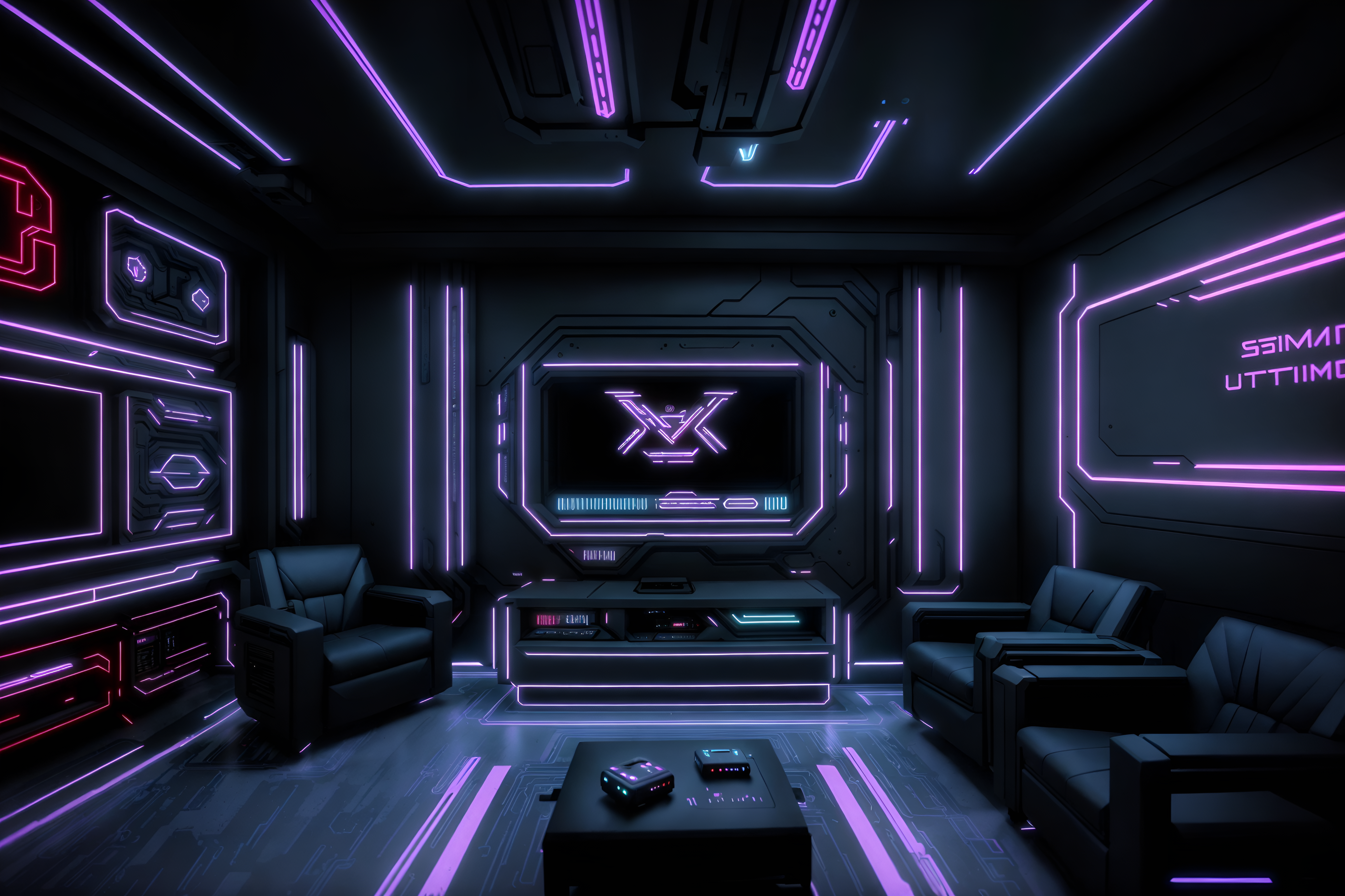 photo from pinterest of cyberpunk-style interior designed (gaming room interior) . with minimalist and futuristic cybernetic city and black lights and synthetic objects and led lights and bladerunner style and synthwave and cyberpunk style. . cinematic photo, highly detailed, cinematic lighting, ultra-detailed, ultrarealistic, photorealism, 8k. trending on pinterest. cyberpunk interior design style. masterpiece, cinematic light, ultrarealistic+, photorealistic+, 8k, raw photo, realistic, sharp focus on eyes, (symmetrical eyes), (intact eyes), hyperrealistic, highest quality, best quality, , highly detailed, masterpiece, best quality, extremely detailed 8k wallpaper, masterpiece, best quality, ultra-detailed, best shadow, detailed background, detailed face, detailed eyes, high contrast, best illumination, detailed face, dulux, caustic, dynamic angle, detailed glow. dramatic lighting. highly detailed, insanely detailed hair, symmetrical, intricate details, professionally retouched, 8k high definition. strong bokeh. award winning photo.