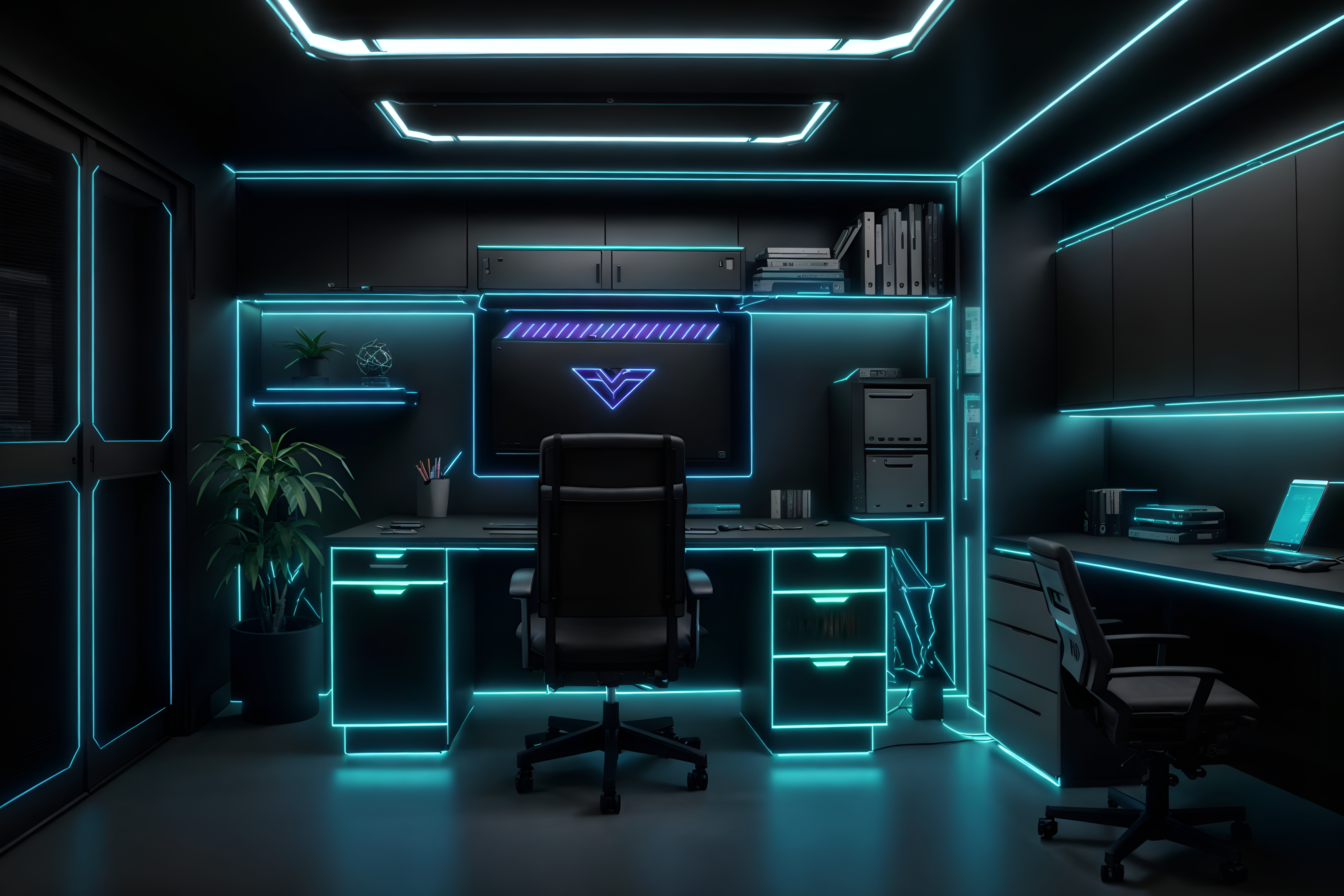 Photo from Pinterest of Cyberpunk-style interior designed (home office interior) With cabinets and office chair and computer desk and plant and desk lamp and cabinets. . With minimalist and led lights and synthetic objects and strong geometric walls and cyberpunk lights and black lights and color lights glow and clean straight square lines. . Cinematic photo, highly detailed, cinematic lighting, ultra-detailed, ultrarealistic, photorealism, 8k. Trending on Pinterest. Cyberpunk interior design style