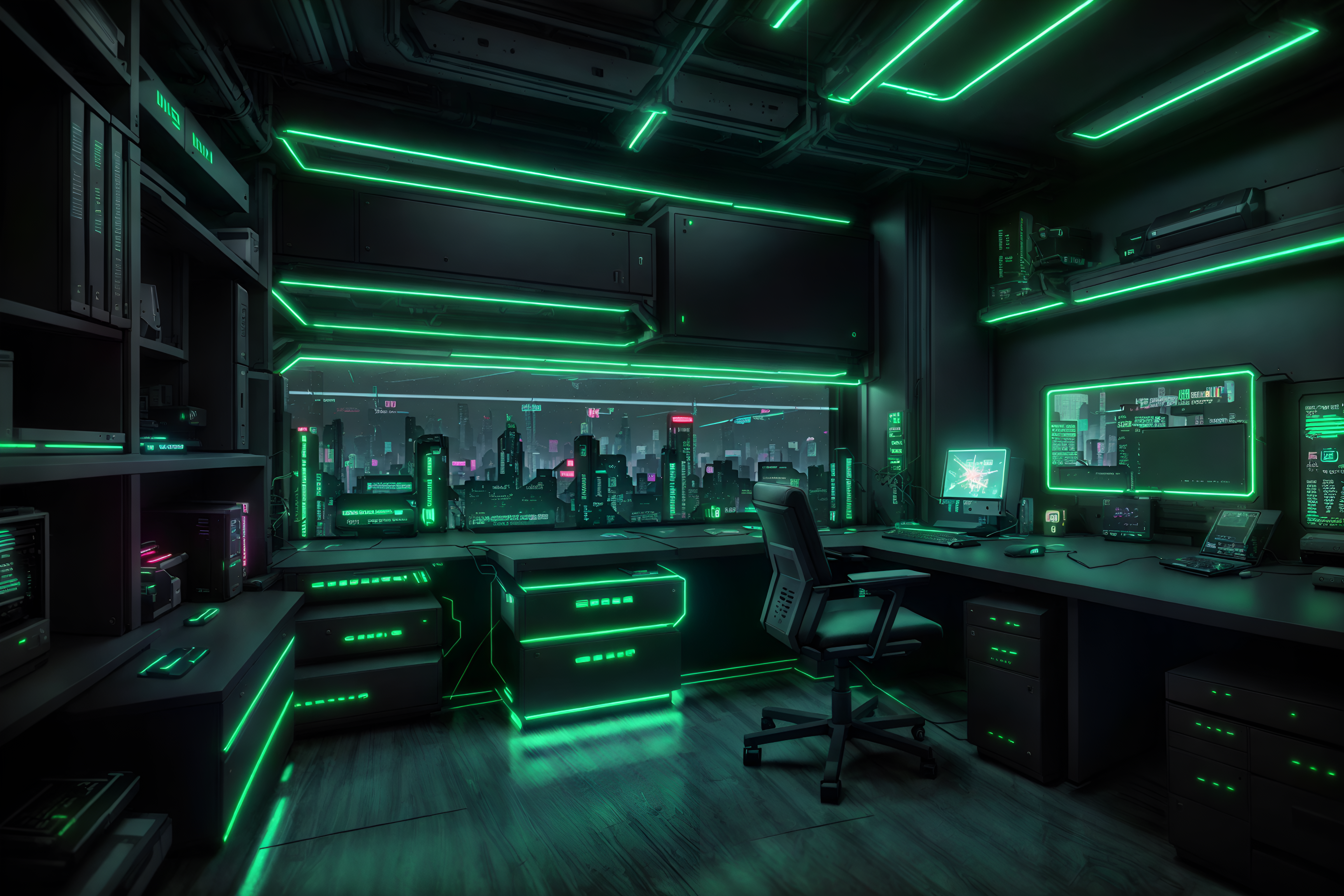 photo from pinterest of cyberpunk-style interior designed (home office interior) with plant and office chair and desk lamp and cabinets and computer desk and plant. . with bladerunner lights and minimalist and strong geometric walls and cyberpunk style and futuristic cybernetic city and cyberpunk lights and cyberpunk lights and led lights. . cinematic photo, highly detailed, cinematic lighting, ultra-detailed, ultrarealistic, photorealism, 8k. trending on pinterest. cyberpunk interior design style. masterpiece, cinematic light, ultrarealistic+, photorealistic+, 8k, raw photo, realistic, sharp focus on eyes, (symmetrical eyes), (intact eyes), hyperrealistic, highest quality, best quality, , highly detailed, masterpiece, best quality, extremely detailed 8k wallpaper, masterpiece, best quality, ultra-detailed, best shadow, detailed background, detailed face, detailed eyes, high contrast, best illumination, detailed face, dulux, caustic, dynamic angle, detailed glow. dramatic lighting. highly detailed, insanely detailed hair, symmetrical, intricate details, professionally retouched, 8k high definition. strong bokeh. award winning photo.