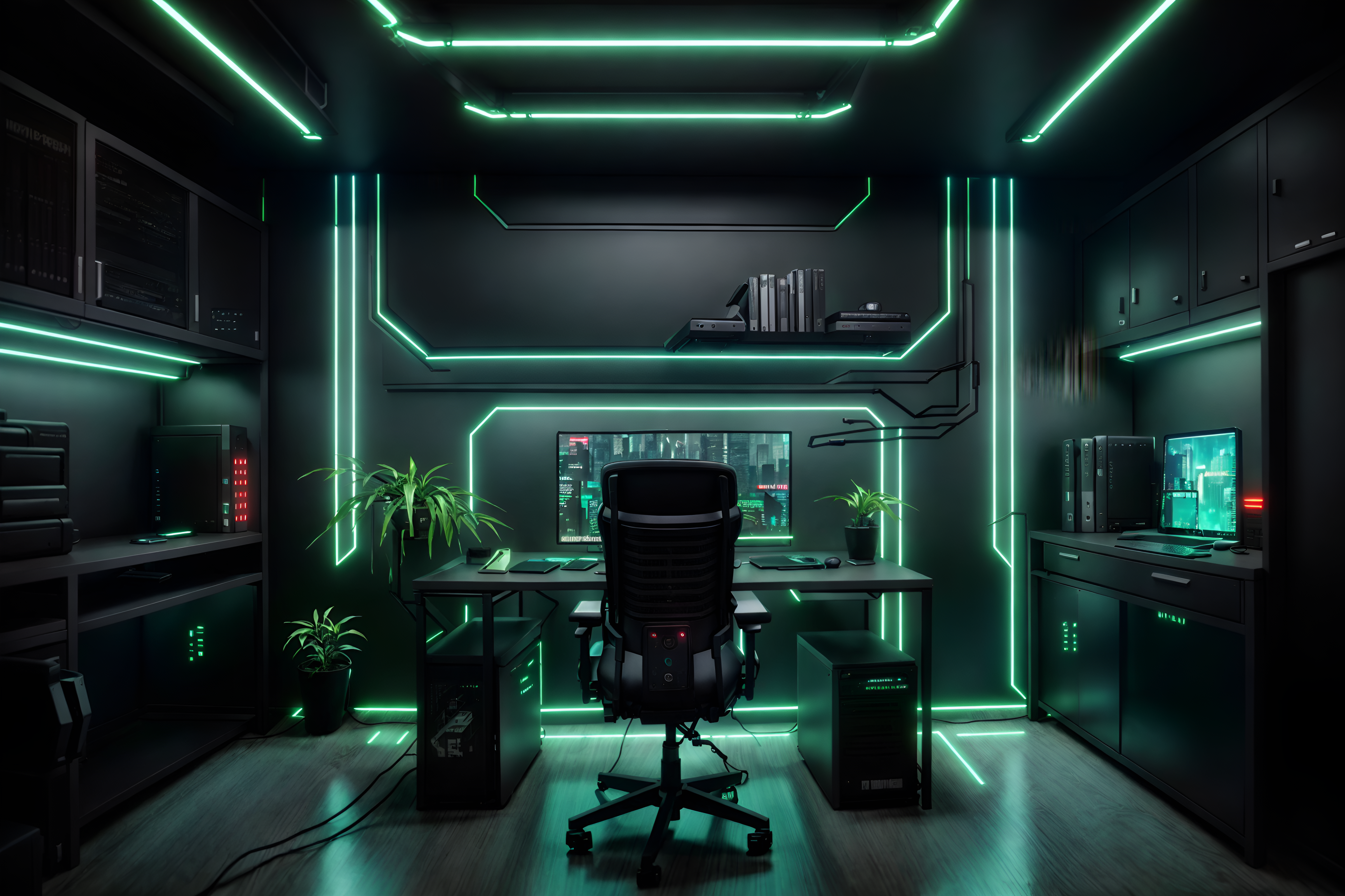 photo from pinterest of cyberpunk-style interior designed (home office interior) with plant and office chair and desk lamp and cabinets and computer desk and plant. . with bladerunner lights and minimalist and strong geometric walls and cyberpunk style and futuristic cybernetic city and cyberpunk lights and cyberpunk lights and led lights. . cinematic photo, highly detailed, cinematic lighting, ultra-detailed, ultrarealistic, photorealism, 8k. trending on pinterest. cyberpunk interior design style. masterpiece, cinematic light, ultrarealistic+, photorealistic+, 8k, raw photo, realistic, sharp focus on eyes, (symmetrical eyes), (intact eyes), hyperrealistic, highest quality, best quality, , highly detailed, masterpiece, best quality, extremely detailed 8k wallpaper, masterpiece, best quality, ultra-detailed, best shadow, detailed background, detailed face, detailed eyes, high contrast, best illumination, detailed face, dulux, caustic, dynamic angle, detailed glow. dramatic lighting. highly detailed, insanely detailed hair, symmetrical, intricate details, professionally retouched, 8k high definition. strong bokeh. award winning photo.