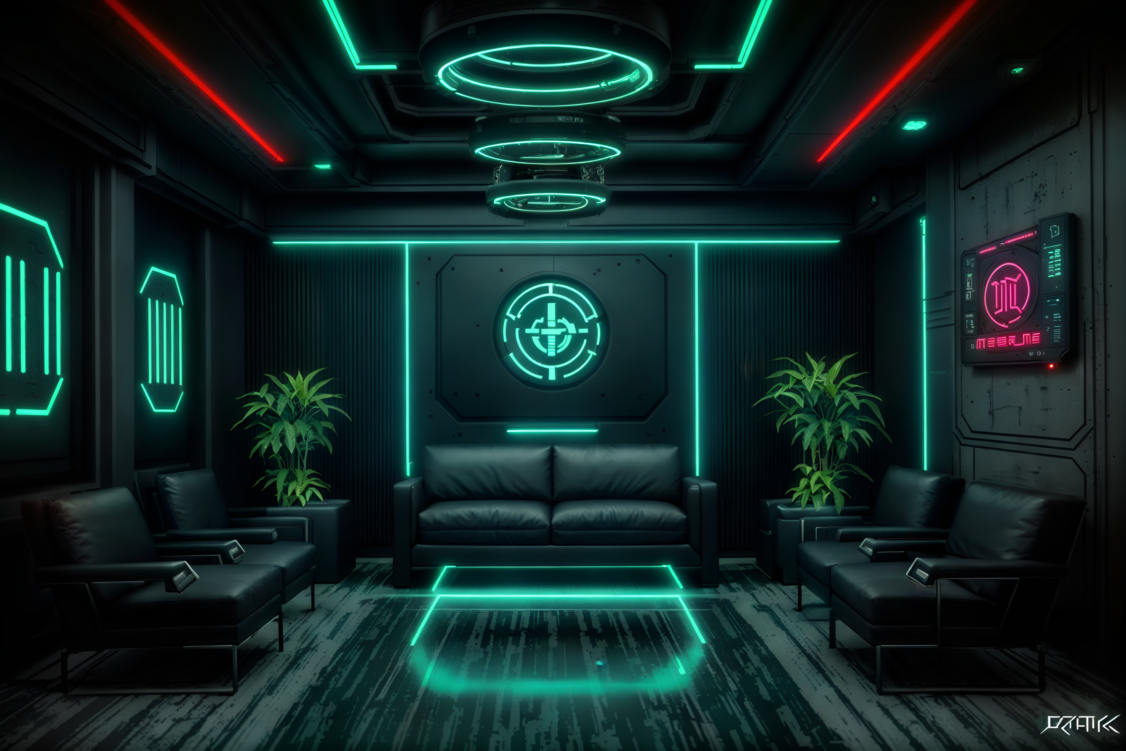 photo from pinterest of cyberpunk-style interior designed (hotel lobby interior) with lounge chairs and sofas and coffee tables and hanging lamps and furniture and plant and rug and check in desk. . with military uniforms and gear and cyberpunk lights and bladerunner style and surrealist paintings and dark night and futuristic cybernetic details and synthetic objects and cyberpunk lights. . cinematic photo, highly detailed, cinematic lighting, ultra-detailed, ultrarealistic, photorealism, 8k. trending on pinterest. cyberpunk interior design style. masterpiece, cinematic light, ultrarealistic+, photorealistic+, 8k, raw photo, realistic, sharp focus on eyes, (symmetrical eyes), (intact eyes), hyperrealistic, highest quality, best quality, , highly detailed, masterpiece, best quality, extremely detailed 8k wallpaper, masterpiece, best quality, ultra-detailed, best shadow, detailed background, detailed face, detailed eyes, high contrast, best illumination, detailed face, dulux, caustic, dynamic angle, detailed glow. dramatic lighting. highly detailed, insanely detailed hair, symmetrical, intricate details, professionally retouched, 8k high definition. strong bokeh. award winning photo.