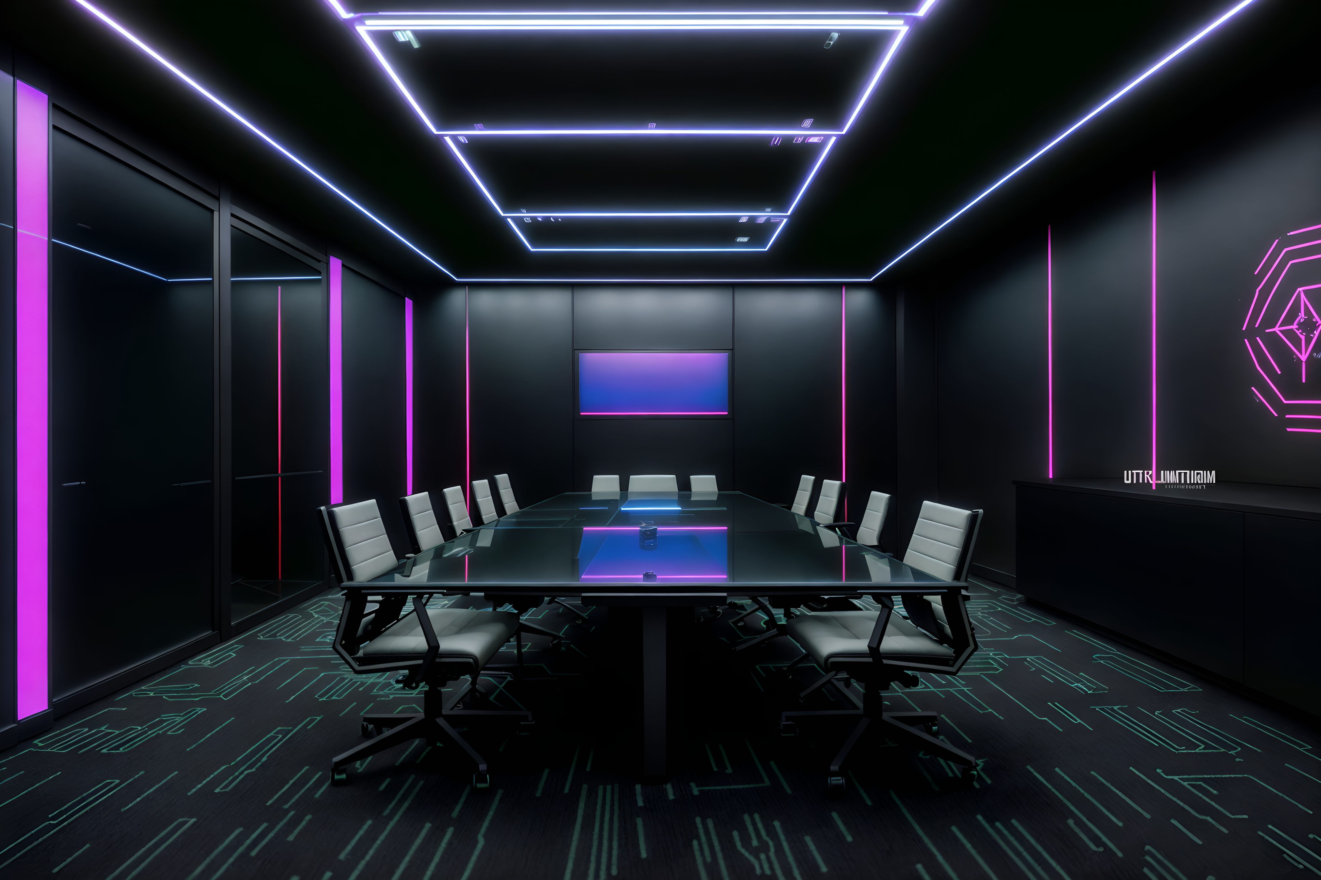 cyberpunk meeting roomsinterior decorate this meeting room with cyberpunk style. . . with vase and office chairs and cabinets and glass doors and boardroom table and glass walls and plant and painting or photo on wall. . with military uniforms and gear and futuristic cybernetic city and bladerunner lights and color lights glow and bladerunner style and cyberpunk style and strong geometric walls and led lights. . .