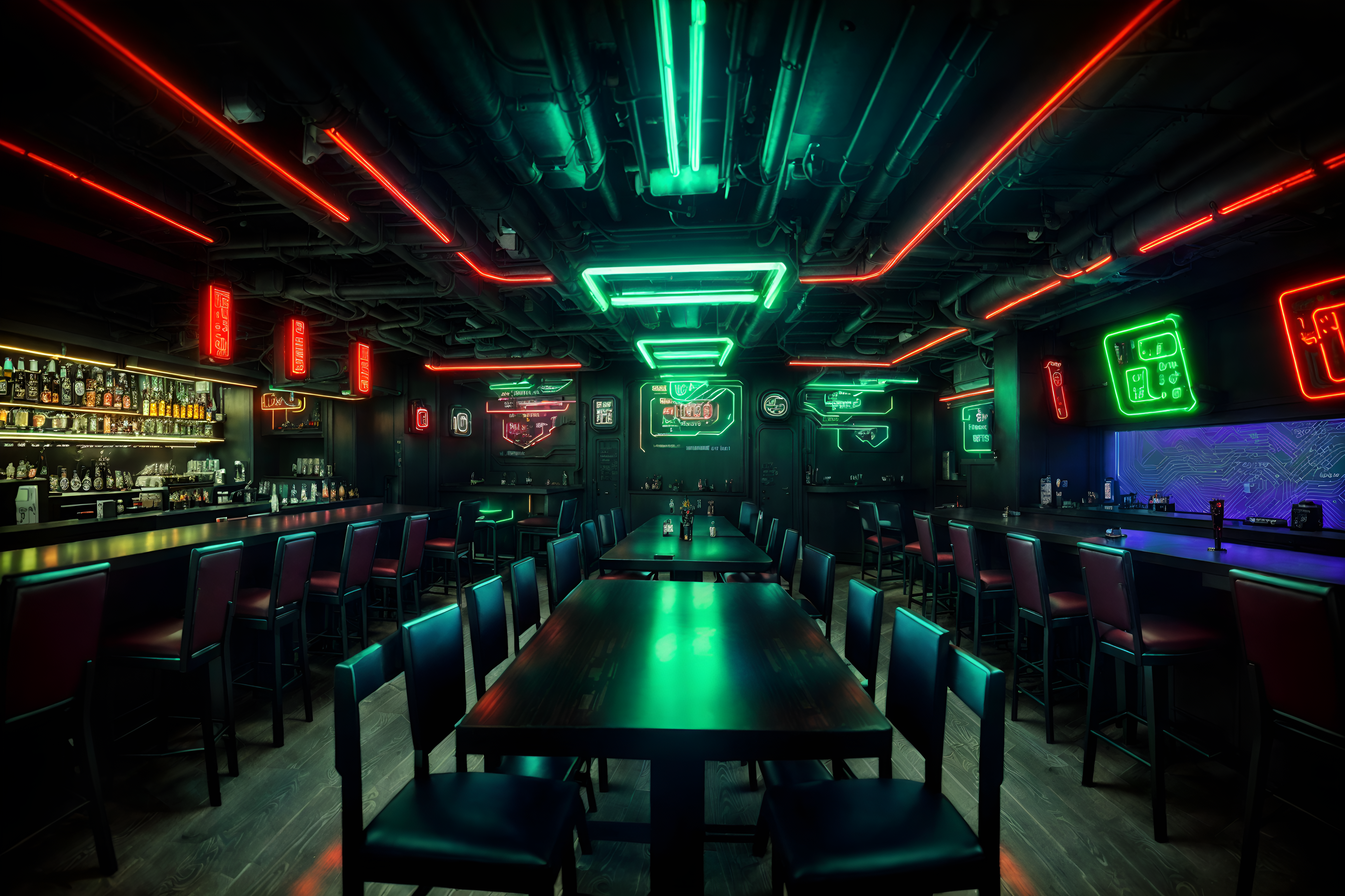 photo from pinterest of cyberpunk-style interior designed (restaurant interior) with restaurant chairs and restaurant bar and restaurant dining tables and restaurant decor and restaurant chairs. . with led lights and cyberpunk style and cyberpunk lights and futuristic cybernetic details and military uniforms and gear and color lights glow and bladerunner lights and cyberpunk lights. . cinematic photo, highly detailed, cinematic lighting, ultra-detailed, ultrarealistic, photorealism, 8k. trending on pinterest. cyberpunk interior design style. masterpiece, cinematic light, ultrarealistic+, photorealistic+, 8k, raw photo, realistic, sharp focus on eyes, (symmetrical eyes), (intact eyes), hyperrealistic, highest quality, best quality, , highly detailed, masterpiece, best quality, extremely detailed 8k wallpaper, masterpiece, best quality, ultra-detailed, best shadow, detailed background, detailed face, detailed eyes, high contrast, best illumination, detailed face, dulux, caustic, dynamic angle, detailed glow. dramatic lighting. highly detailed, insanely detailed hair, symmetrical, intricate details, professionally retouched, 8k high definition. strong bokeh. award winning photo.