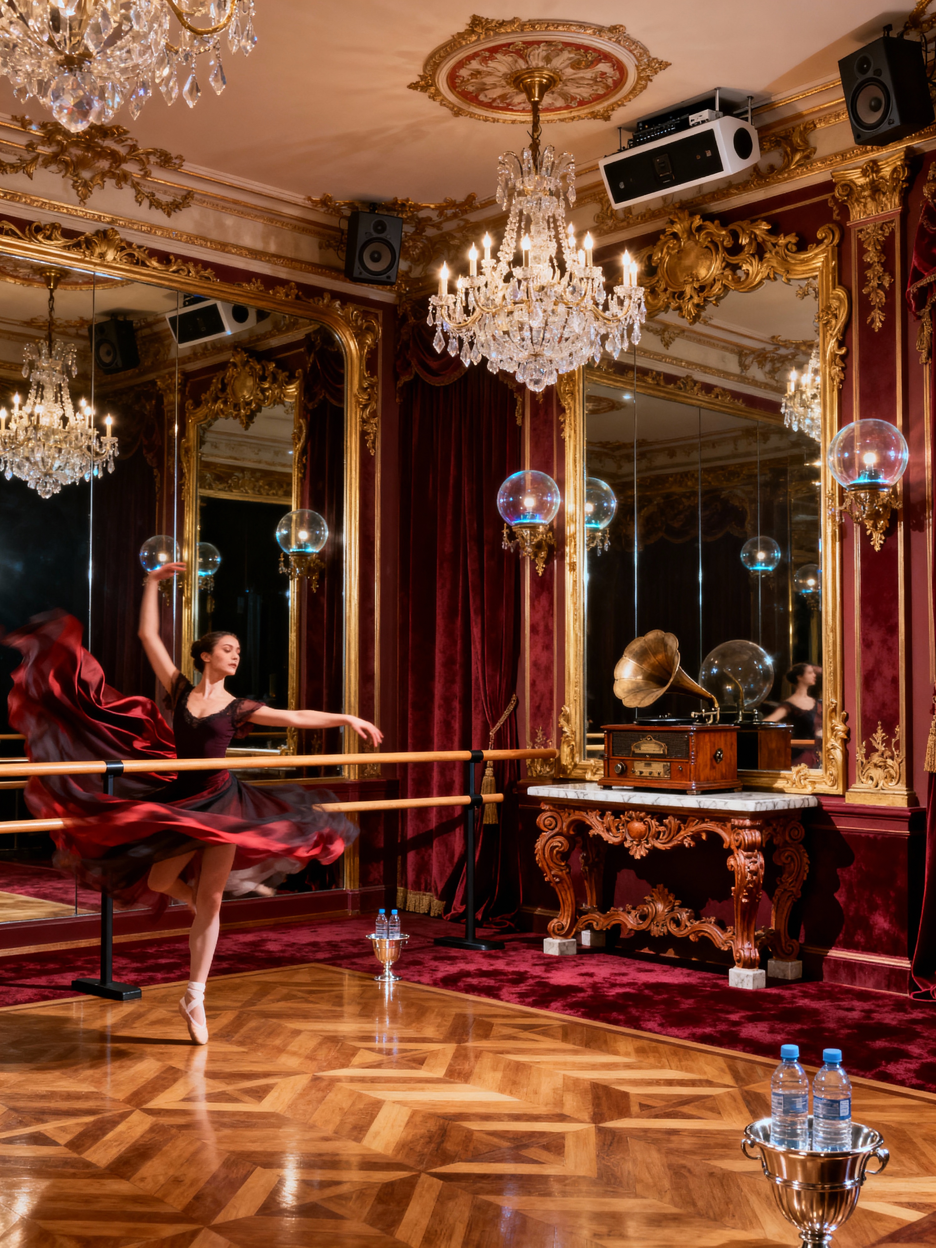 dance studio with baroque style with music player and exercise equipment and ballet barre and sound system and speaker and water bottles and wooden floor and mirrors. . with expensive and plush flooring and heavy moldings and movement and dynamism and drama and tension and emotional exuberance and crystal and glass accents