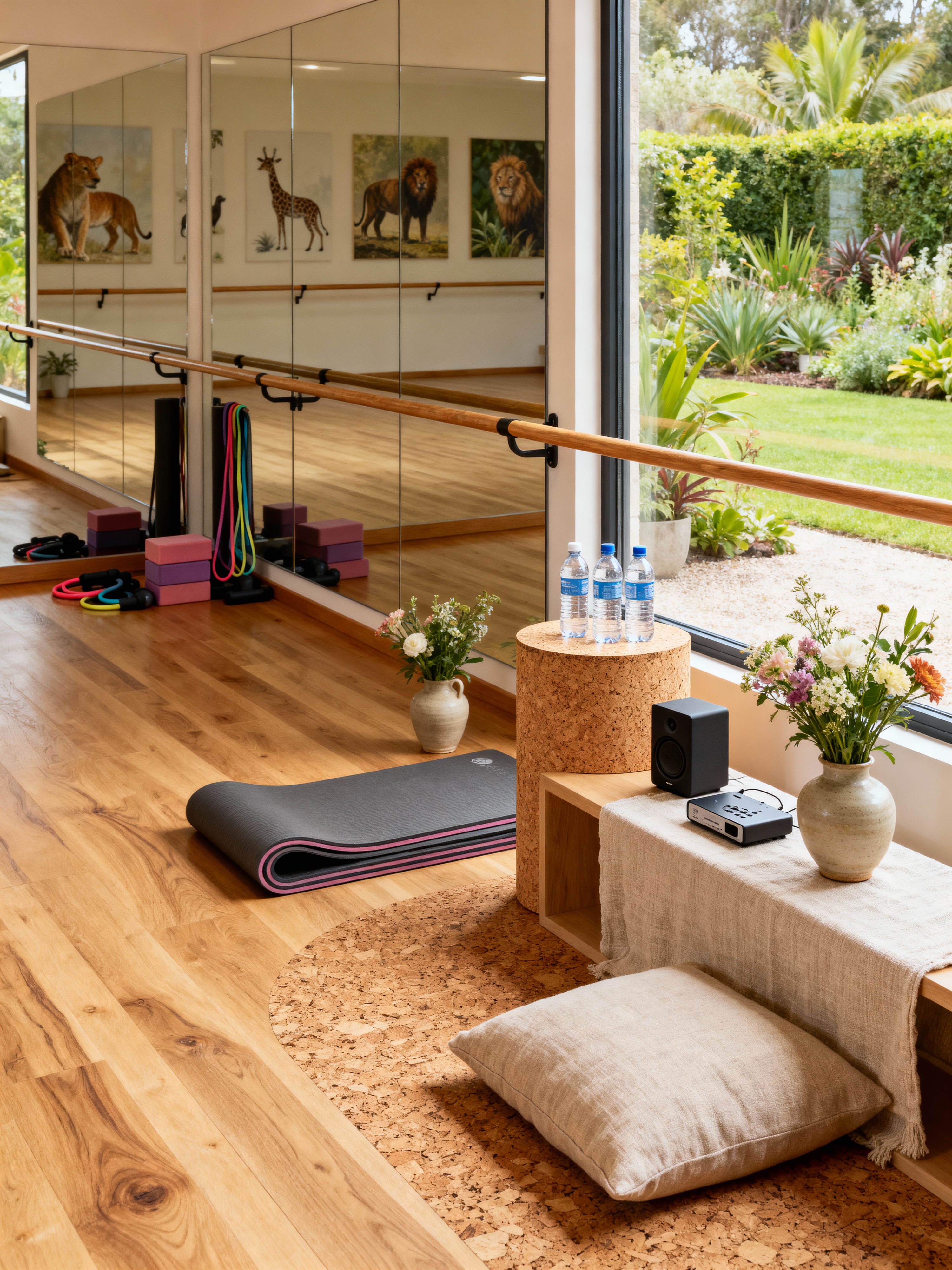 dance studio with biophilic style with exercise equipment and mirrors and wooden floor and dance mats and water bottles and speaker and music player and ballet barre. . with ceramic materials and linen materials and natural environment and images of animals and features of the natural world and plants and fresh air and cork materials